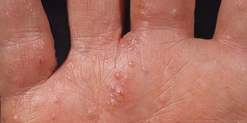 Дисгидроз – кожное заболевание, которое характеризуется нарушением работы потовых желез, их закупоркой и появлением на коже мелких зудящих пузырьков. Оно поражает кожу ладоней и пальцев кистей, подошв ног. Реже – тыльные поверхности кистей и стоп.