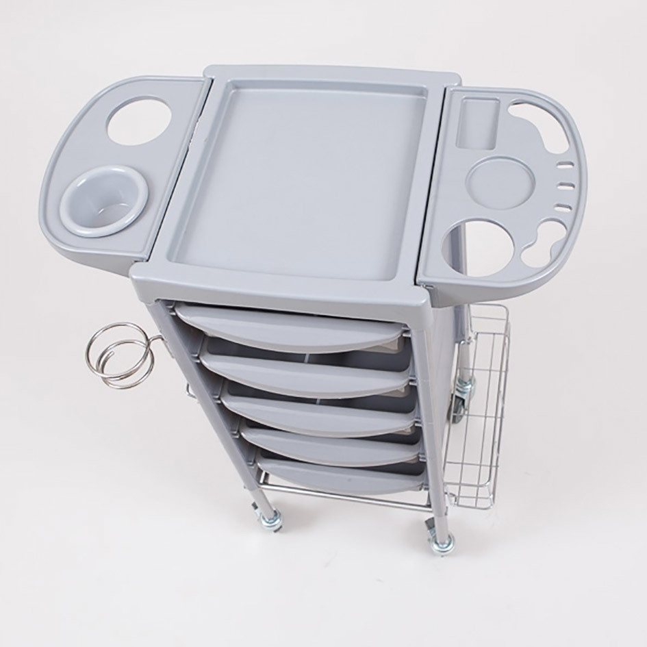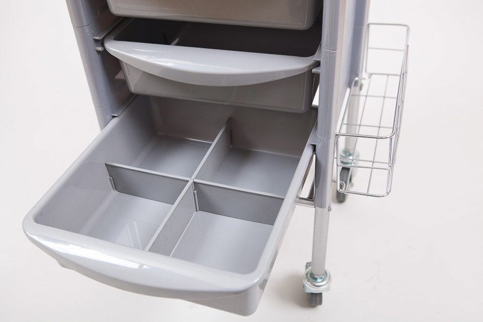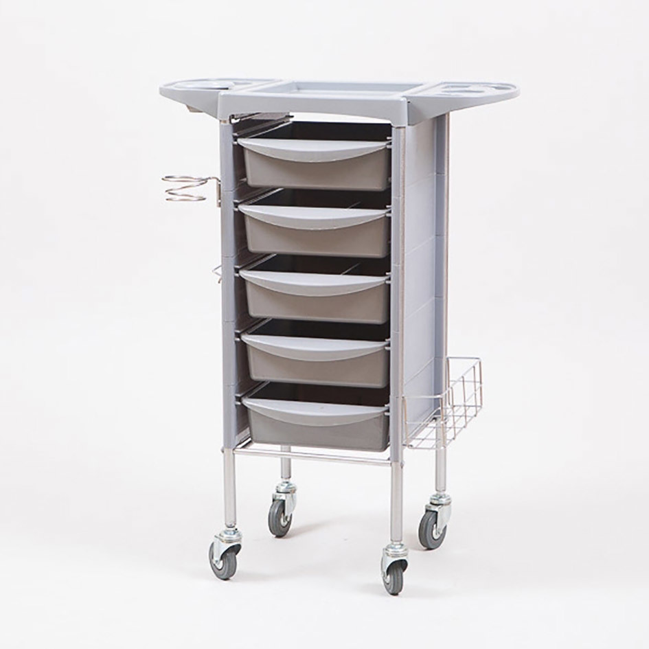 Стильная парикмахерская тележка SD-3013A выполнена в сером цвете и оборудована прочными прорезиненными колесиками, которые делают ее мобильной и функциональной.