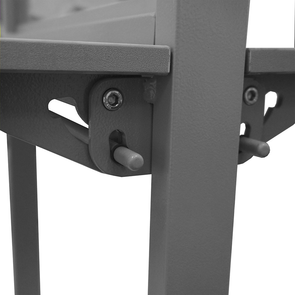 Зеркало двухстороннее на силиконовых колесных опорах с подшипниками. Имеет металлическое основание, полочки выполнены из ЛДСП. Под полками расположен «Пилот» для подключения оборудования. Вывод удлинителя может быть выполнен вверх или вниз. Каждое зеркало имеет толщину 5 мм. Металлический каркас окрашен порошковой краской.