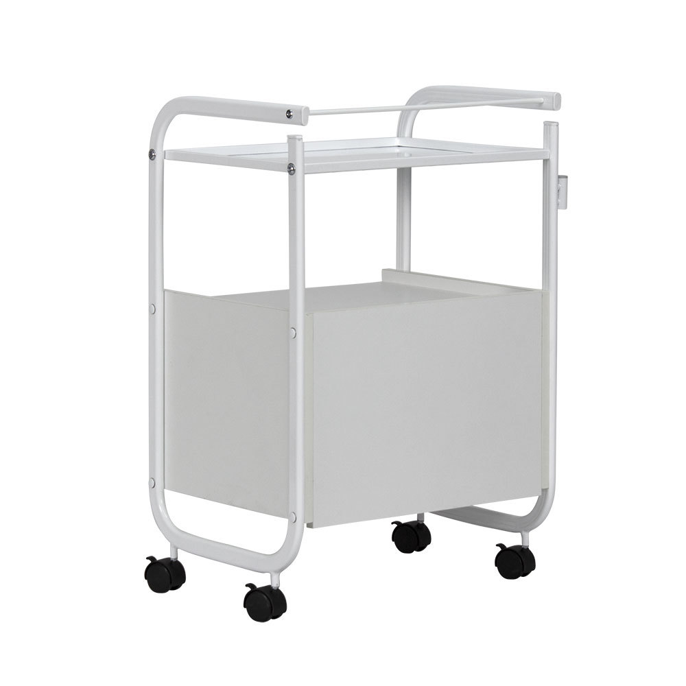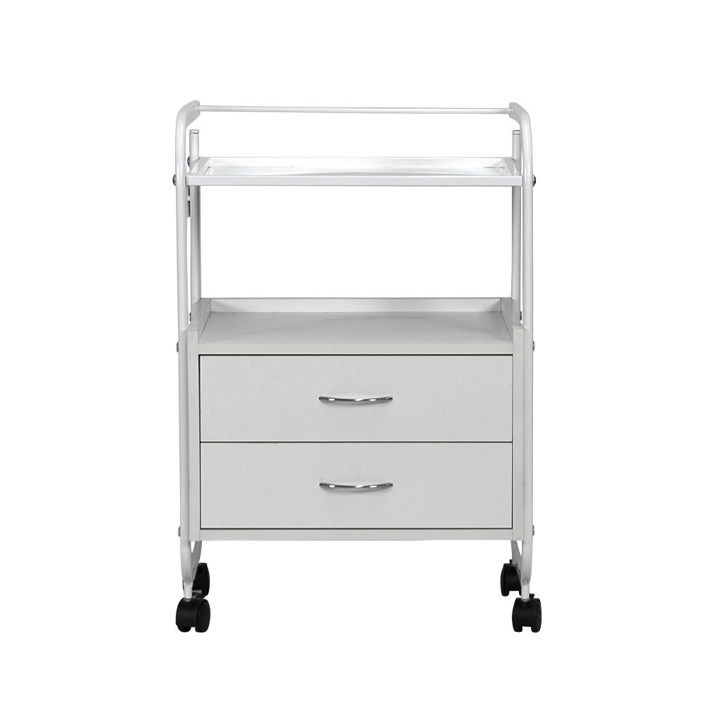 Стоит отметить, что данное косметологическое спецоборудование исполнено из прочного долговечного металла, покрытого специфическим влагоотталкивающим покрытием, за счёт чего тележка не поддаётся коррозии. За таким оборудованием легко ухаживать, ведь покрытие выдерживает влагу и дезинфицирующие средства. Каркас косметологической тележки состоит из металлической полочки с бортиками и тумбочки с двумя выдвижными ящичками. На верхней полочке удобно расположить инструменты, использующиеся во время работы. А удобный бортик защитит от случайного падения инструмента. Во вместительной тумбе с двумя ящиками поместиться остальной инвентарь. Над тумбой под полочкой также можно хранить инвентарь, например высокие баночки или небольшую косметологическую технику.