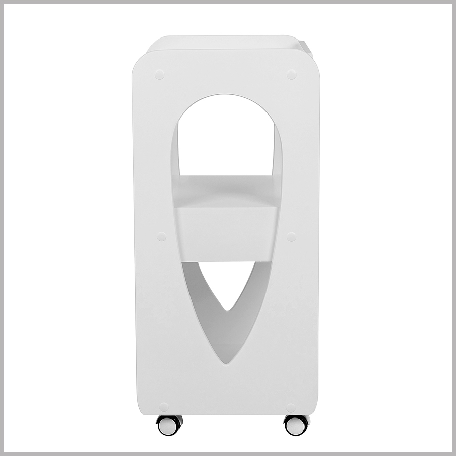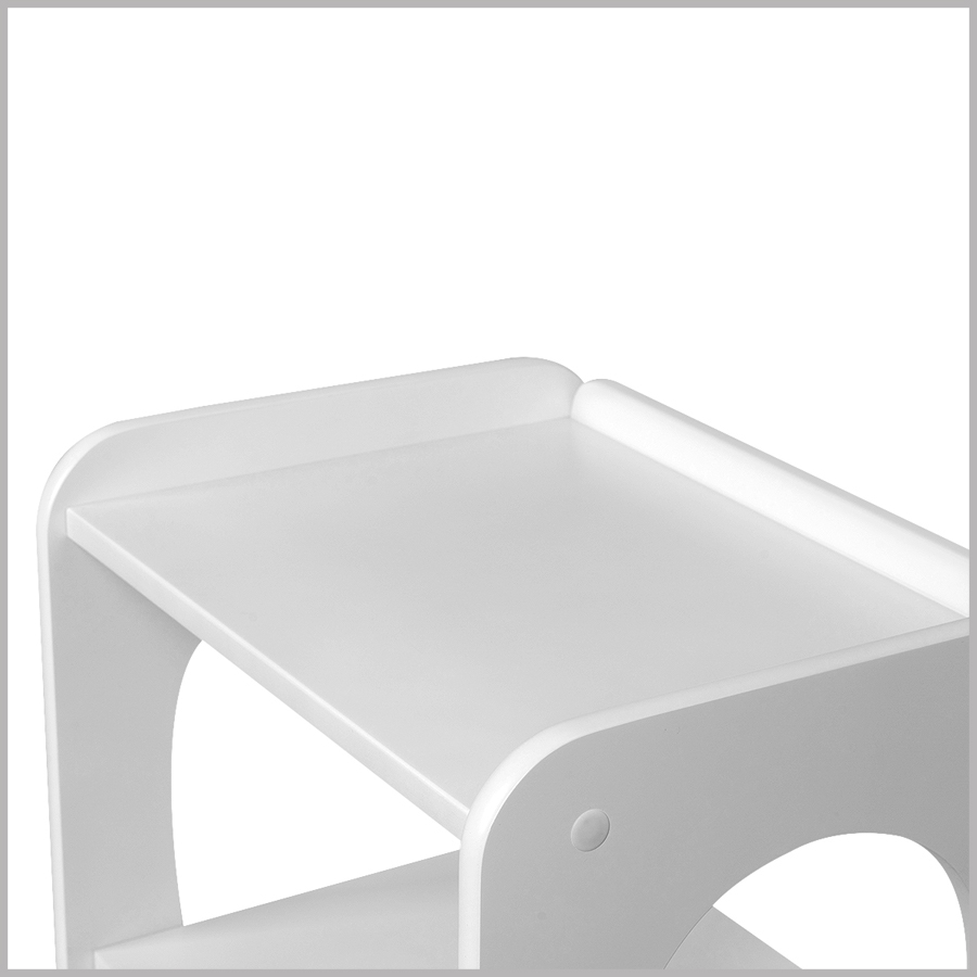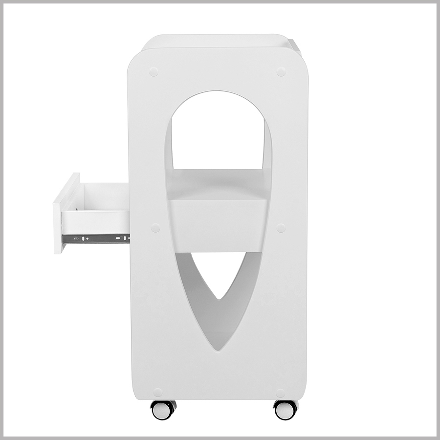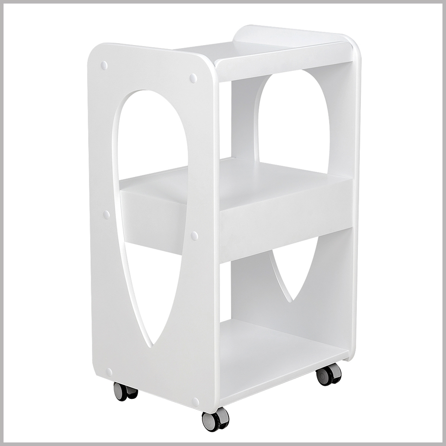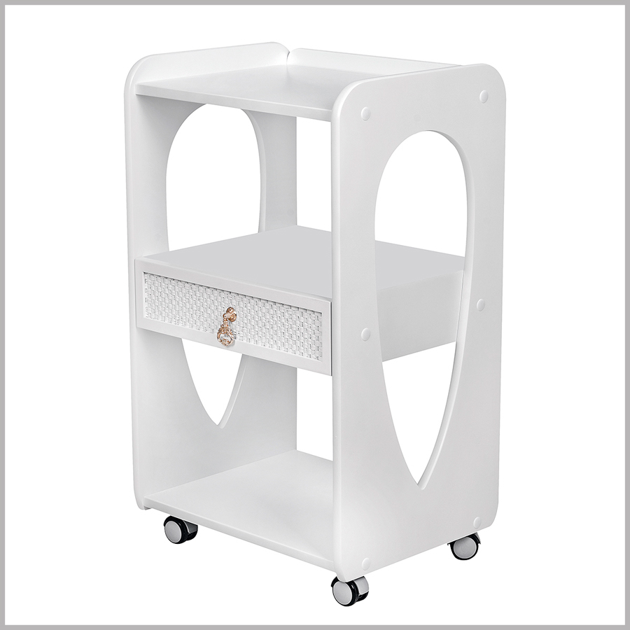 Комплектация: 1 выдвижной ящик с декорированной накладкой и 3 открытые полки; верхняя полка с бортиками; материал – дерево; 2 цвета; 4 опорных колеса, двойные, съемные.