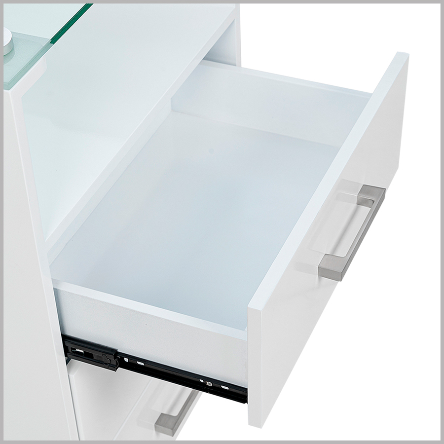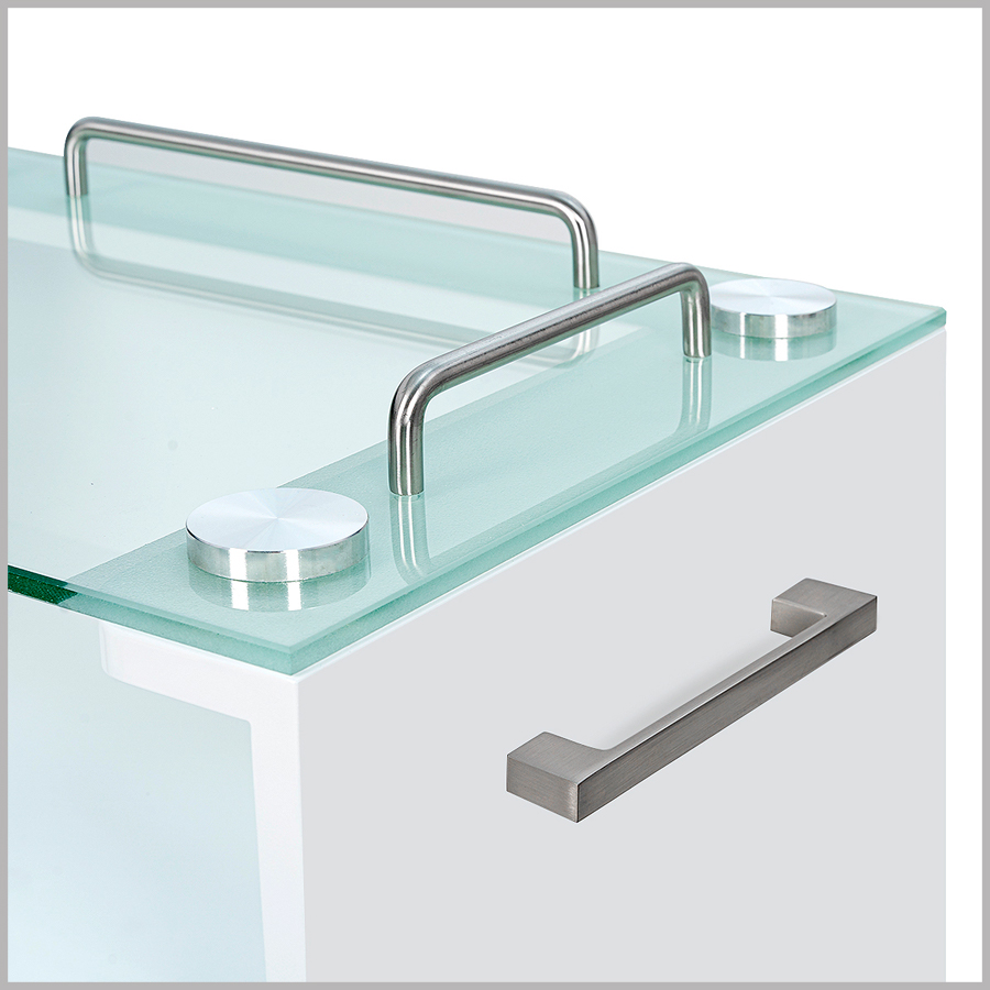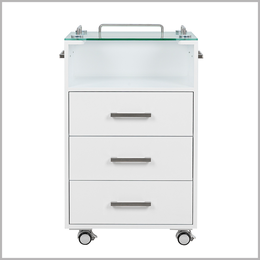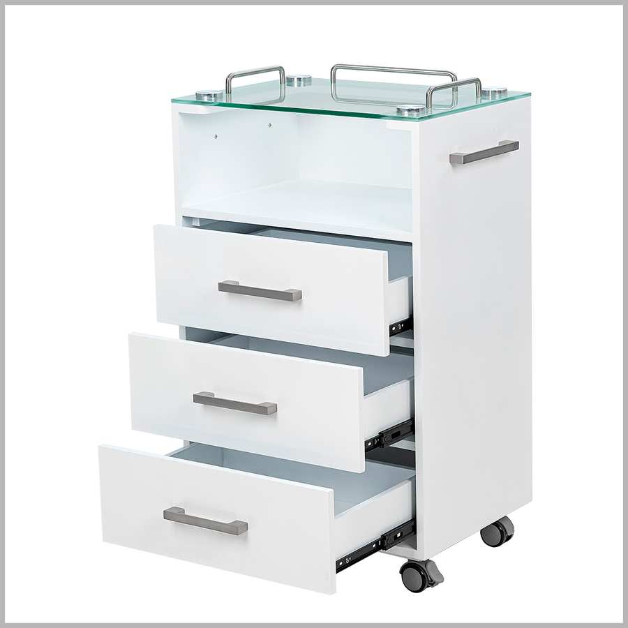 Комплектация: стеклянная верхняя полка с хромированными бортиками, 3 выдвижных ящика и 1 полка, ручки по бокам тумбы, 4 опорных колеса, двойные, съемные, 2 передних со стопами.