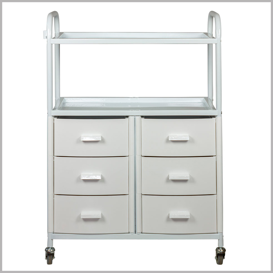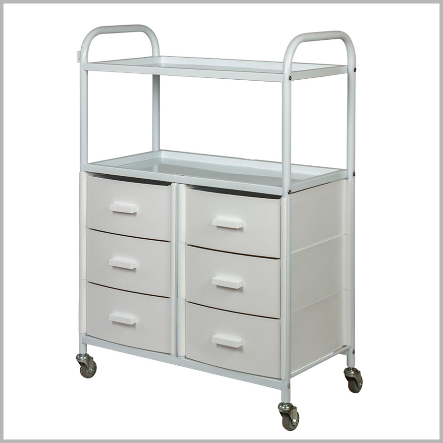 Для инструментов, аксессуаров и расходных материалов достаточно места в шести выдвижных ящиках. Полки можно использовать как для необходимых приспособлений, так и для установки небольших аппаратов. Несомненным плюсом косметологического оборудования являются встроенные маневренные колесики. Мастер без особых усилий может перемещать косметологическую тележку по рабочей зоне.