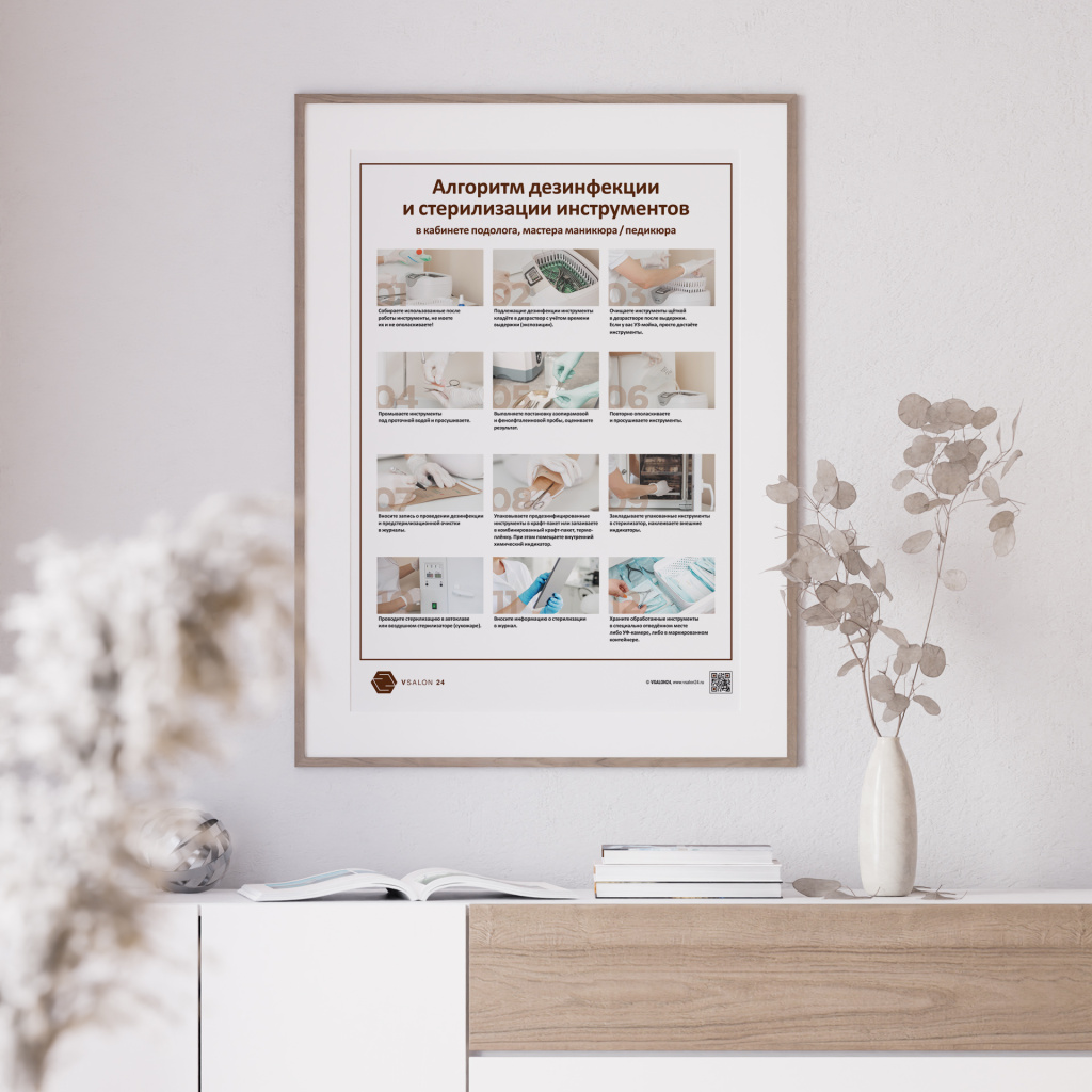 В современной индустрии красоты и заботы о здоровье безопасность клиентов и высокий уровень гигиены играют решающую роль. Особенно важно обеспечить дезинфекцию и стерилизацию инструментов, используемых в салонах красоты и кабинетах подолога. Для эффективного осуществления этих процедур специалистами компании VSALON24 был разработан плакат «Алгоритм дезинфекции и стерилизации инструментов», который не только гарантирует безопасность клиентов, но и подтверждает профессионализм и ответственность салона или подологического кабинета перед ними.