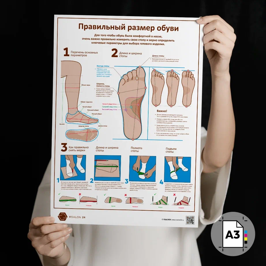 Представляем вашему внимание плакат РАЗМЕР ОБУВИ в формате А3 в Ваш кабинет.Печать высокого качества 4+0 на белой бумаге Сити.