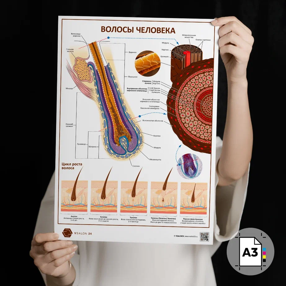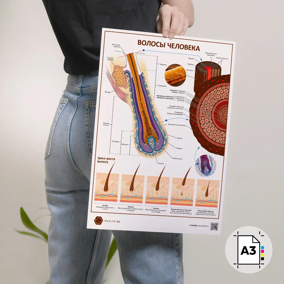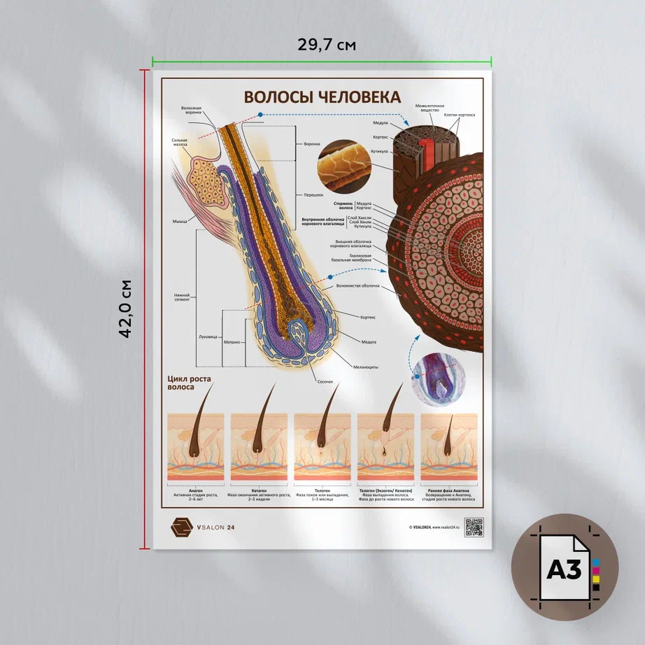 Представляем Вашему вниманию плакат Волосы человека в формате А3 в Ваш кабинет.Печать высокого качества 4+0 на белой бумаге Сити.