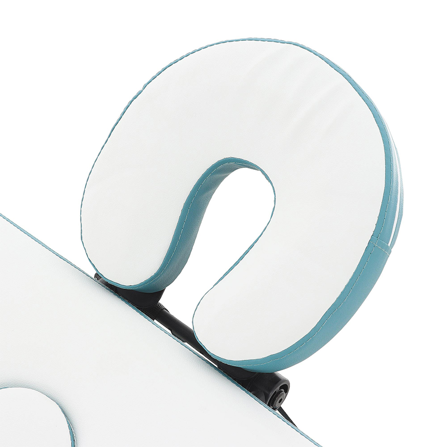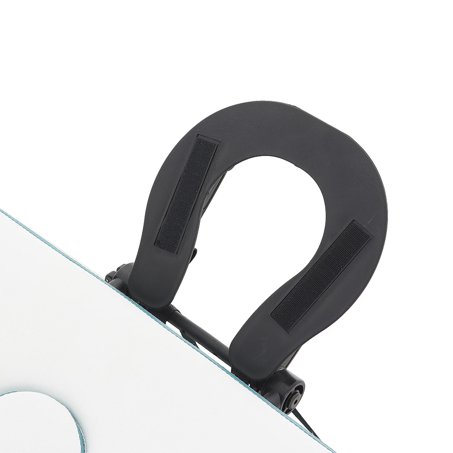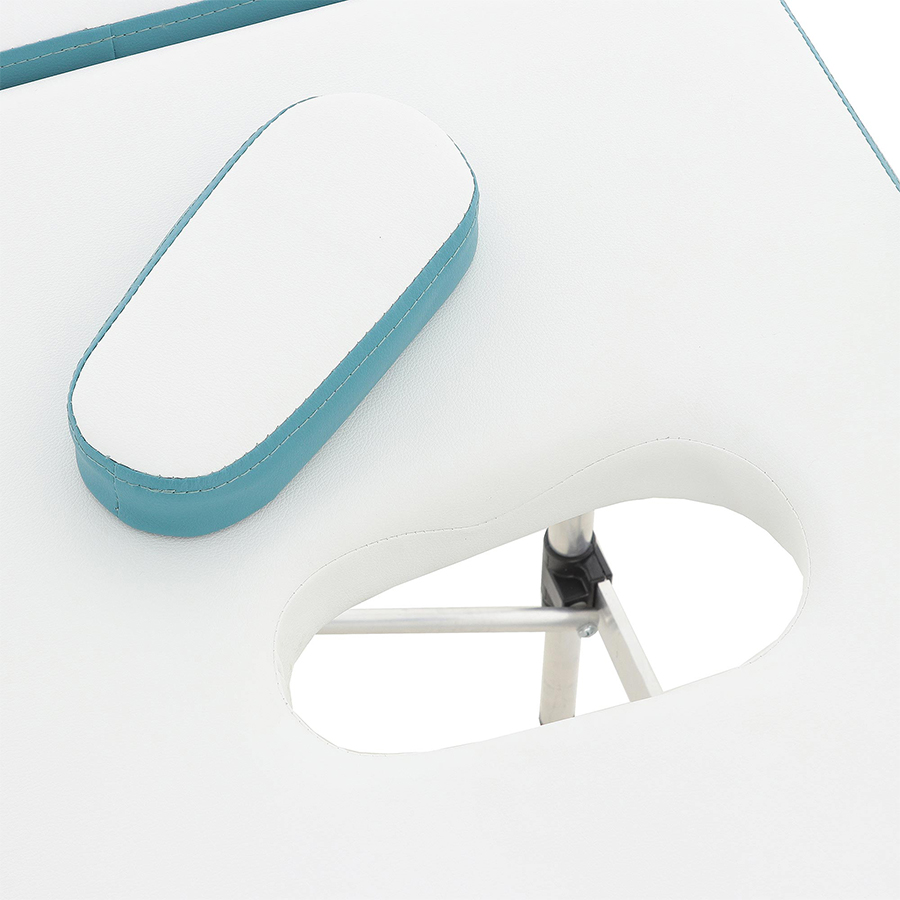 Ложе: 185x70 см, 3 секции, из них 1 подвижная, с обивкой из ПВХ-кожи, наполнитель - ППУ (толщина 5 см), с овальным отверстием для лица (люверсом) - 22x10-11 см с заглушкой, 2 шт. мягких ручек на бок.поверхностях и 4 шт. пластиковых ножек на противоположной бок. поверхности для переноски стола в собранном виде.