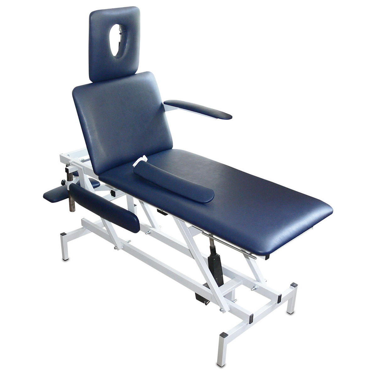 Стол оснащен двумя парами мягких подлокотников. Основная пара предназначена для поддержки рук клиента при положении «руки к голове» и регулируется вверх-вниз, влево-вправо. Дополнительные подлокотники используются в нижнем положении как опора для колен мастера, в верхнем – как дополнительное расширение поверхности стола.