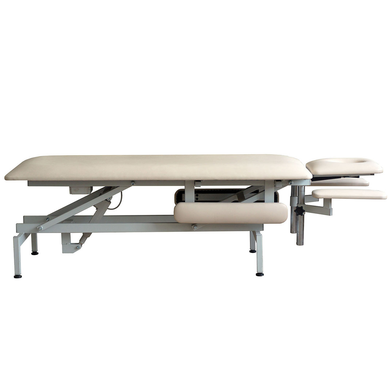 Рабочая поверхность стола поднимается при помощи электропривода, для изменения угла наклона подголовника используется газовая пружина.