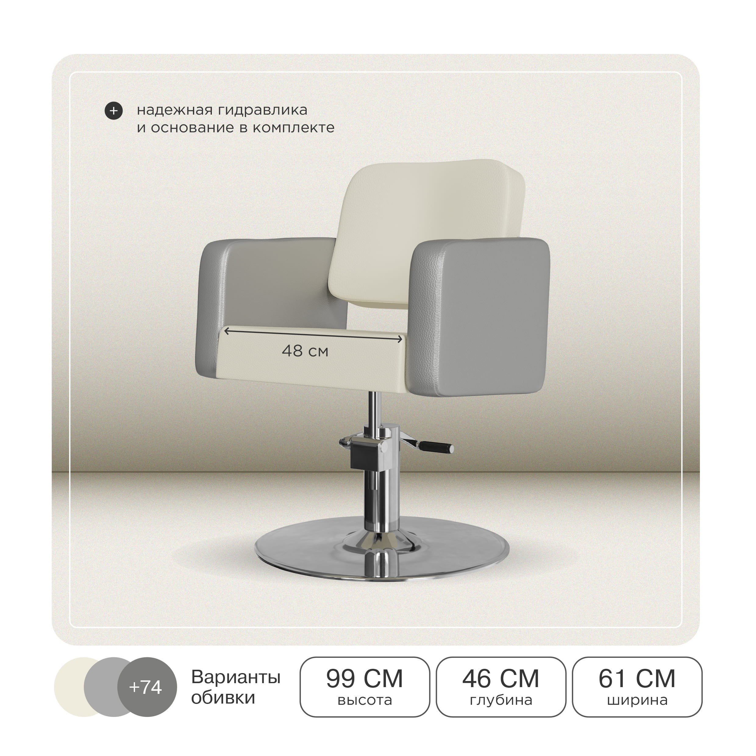 Удобное сидение с мягкой спинкой в сочетании с подлокотниками помогут обеспечить комфорт каждому клиенту. В качестве наполнителя применён плотный поролон, который не образует вмятин в течение длительного срока эксплуатации. Для обшивки использована прочная экокожа, устойчивая к разрывам, растягиванию и протиранию. Уход за поверхностью необычайно прост, потому что материал не впитывает влагу и грязь. Пыль с такой мебели можно удалить сухой текстильной салфеткой, а пятна от косметических продуктов стираются специальными моющими составами для кожи.