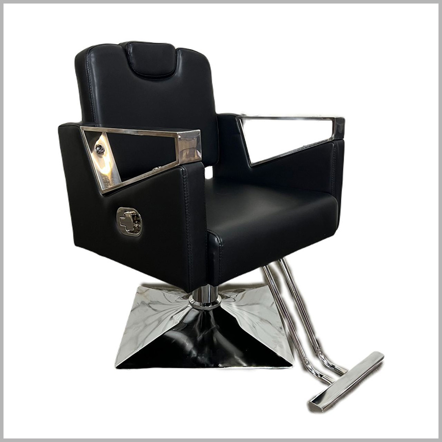 Подлокотники с металлическими вставками придают креслу особый запоминающийся стиль. Мягкое сиденье и спинка обиты стойкой экокожей. Подголовник регулируется. Мастер может настроить высоту кресла под каждого клиента индивидуально.