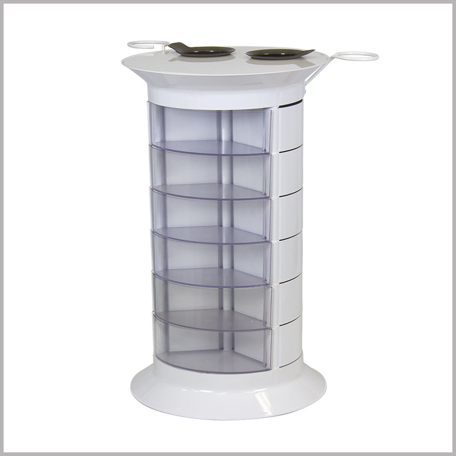 Основание тележки изготовлено из прочного металла, который надежно защищен от влаги и коррозии. Ящики выполнены из качественного пластика. Материал отлично моется, дезинфицируется и не портиться при случайном попадании косметических препаратов. Колеса, изготовленные из пластмассы, не поцарапают напольное покрытие.