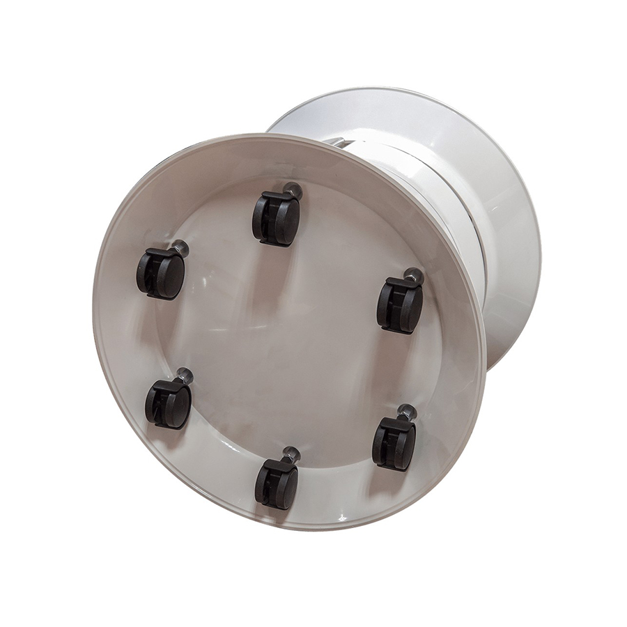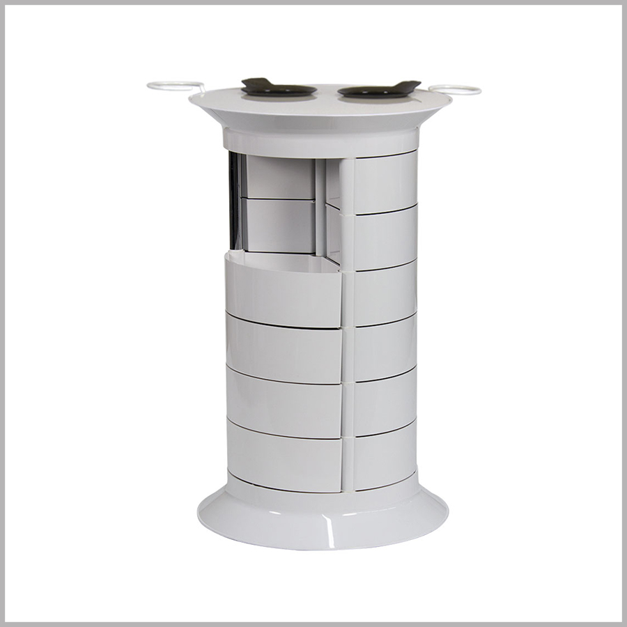 Продуманная конструкция позволит мастеру хранить все свои приспособления в одном месте. В распоряжении специалиста 16 раздвижных ящичков, которые поворачиваются вокруг стоек каркаса. Чтобы в тумбе можно было поставить высокие сосуды, с одной стороны отсутствует два ящика. Верхняя полка имеет специальные отверстия, предназначенные для емкостей и чаш. С двух сторон крышка оборудована держателями для фенов. Мобильность мебели обеспечивается шестью поворотными колесиками. Тележка может быть использована для обстановки двух рабочих мест.