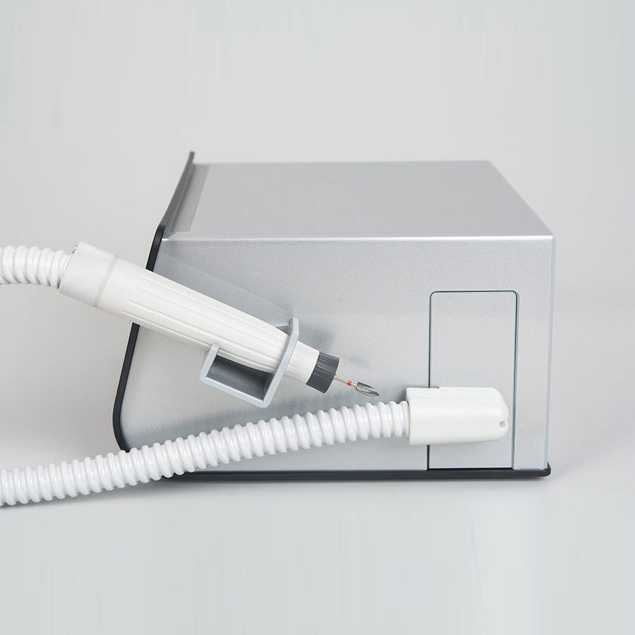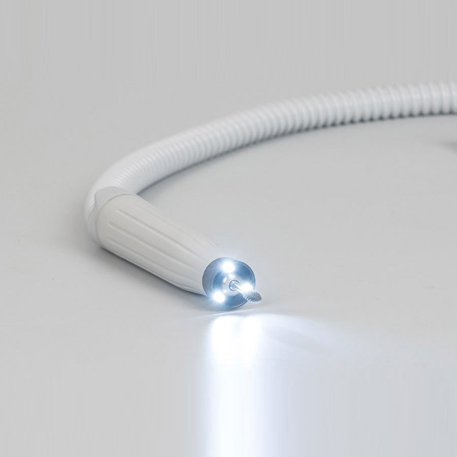 - Эргономичность — удобный и легкий корпус микромотора изготовлен из матированного пластика, на наконечнике расположен переключатель вкл/выкл, оснащен LED подсветкой с тремя светодиодами.