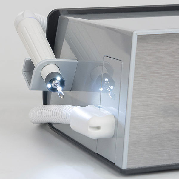 Аппарат оборудован усовершенствованным встроенным пылесосом и эргономичным наконечником со встроенной LED подсветкой с тремя светодиодами. Модель оснащена тремя настраиваемыми ячейками памяти для быстрого перехода к собственным настройкам скорости вращения фрезы и мощности всасывания пылесоса.