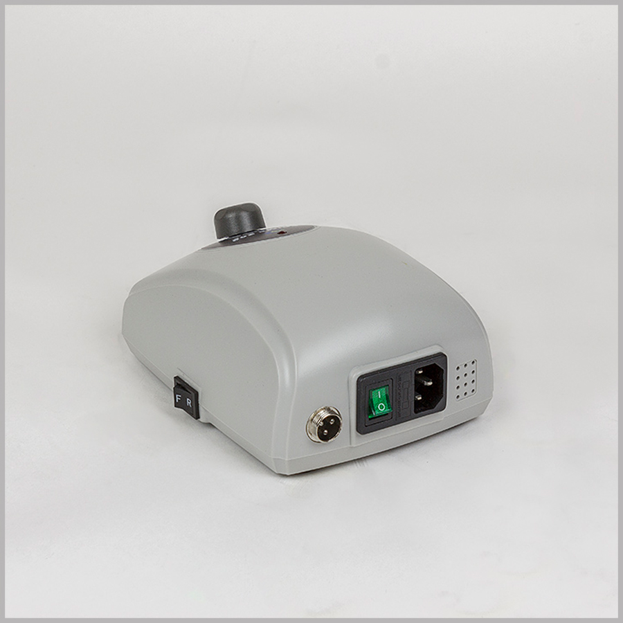 На лицевой части блока питания находится индикатор работы фрезера и переключатель скоростей. На боковой панели есть кнопка реверса (смена направления вращения фрезы). Для ручки предусмотрена подставка. В комплект входит ножная педаль плавного регулирования оборотов.