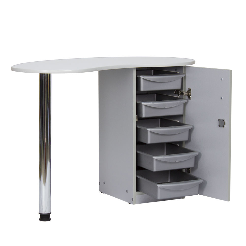 Столешница изготовлена из ламинированного ДСП. От механических повреждений поверхность защитит противоударная окантовка из эластичного пластика. Рабочее место должно быть качественным и удобным, поэтому стол имеет закруглённые углы и плавный изгиб со стороны мастера. Для оптимизации работы нейл-мастера, конструкция стола дополнена тумбочкой с вместительными ящичками. В лотках можно хранить множество инструментов, приспособлений, расходных материалов. К тому же дверка закрывается на ключ, гарантируя сохранность оборудования. Размер поверхности позволяет размещать некоторые приспособления непосредственно на ней. Для изготовления деталей маникюрного стола использовались только износостойкие материалы. Мебель выдержит моющие, дезинфицирующие средства, а также не деформируется от случайно пролитых агрессивных веществ. Все металлические детали хромированные.