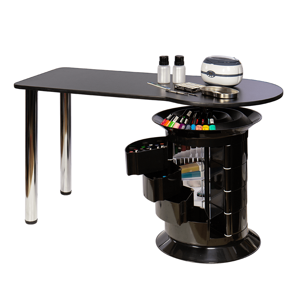 Инструменты, расходные материалы и аксессуары можно хранить в удобных выдвижных ящичках. Мастер сможет с легкостью находить необходимые приспособления, ведь тумбу можно вращать вокруг своей оси. Для лаков над тумбой предусмотрена удобная полочка. С широкой столешницей есть возможность поставить необходимое сопутствующее оборудование, не загромождая рабочую поверхность.