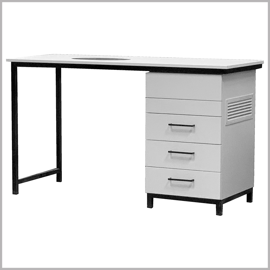 Столешница и тумба стола изготовлены из ЛДСП. В стол интегрирована мощная вытяжка (60 Вт, 850 м.куб/час) с фильтром-касетой, который легко чистится и меняется. Вентиляционный канал проходит под столешницей. Поток воздуха от вытяжки выходит через решетку, расположенную на боковой стенке тумбы