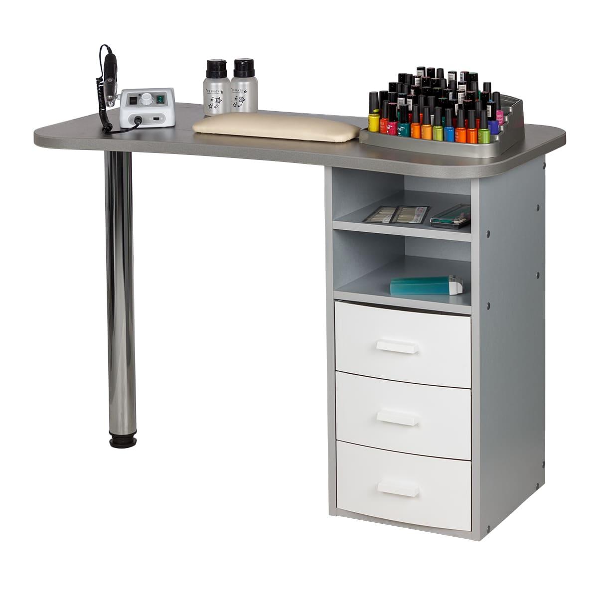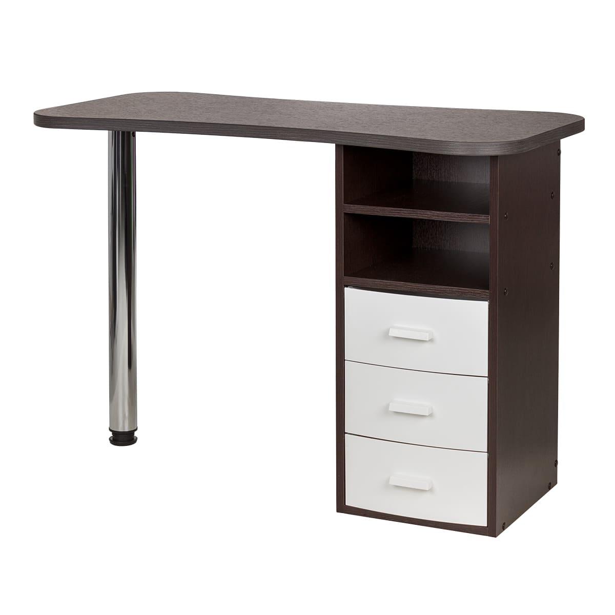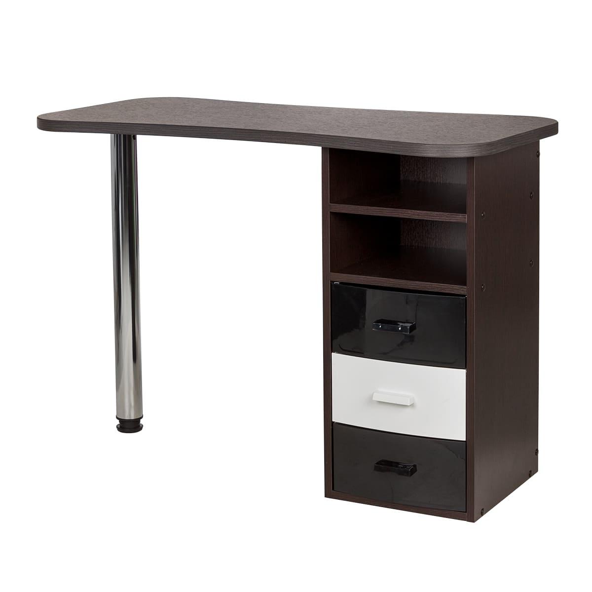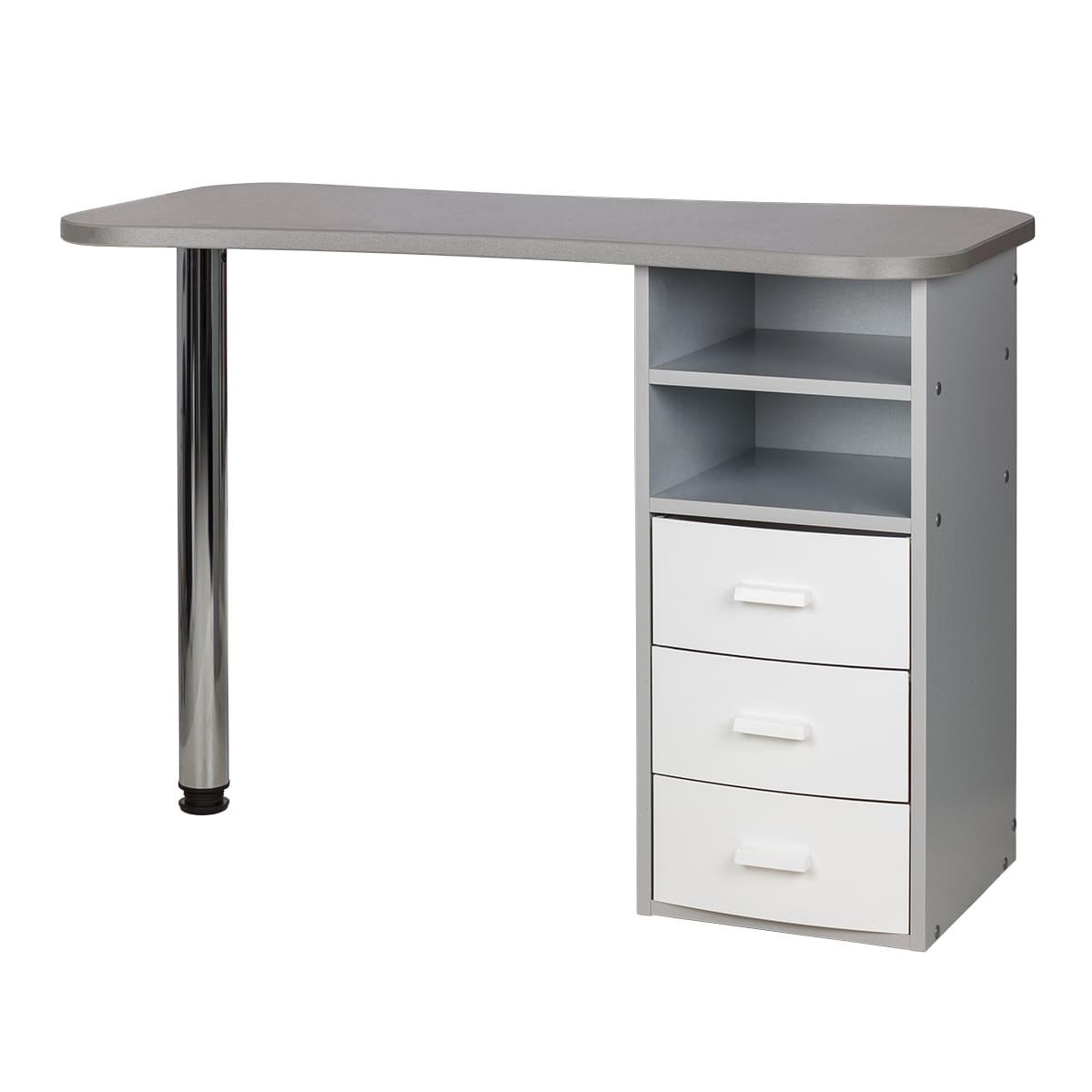 Столешница удобной изогнутой формы позволяет расставить необходимые инструменты и аппараты, а также обеспечивает доступ к рукам клиента. Секция хранения – тумба с тремя ящиками и двумя открытыми полками, в которых достаточно места для приспособлений мастера.