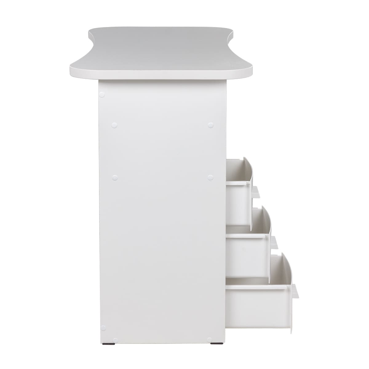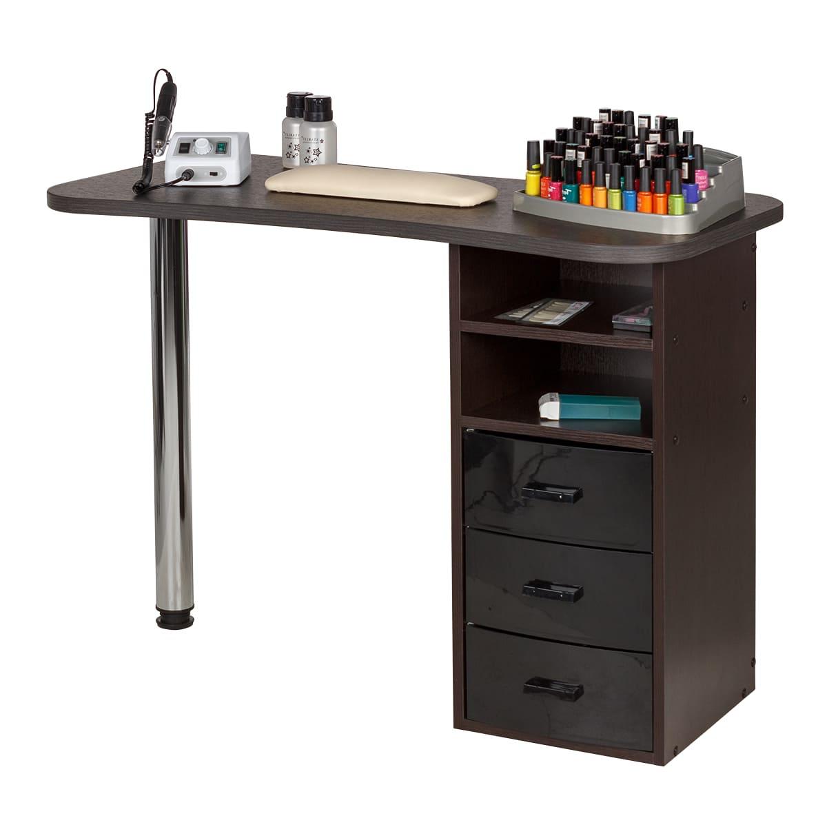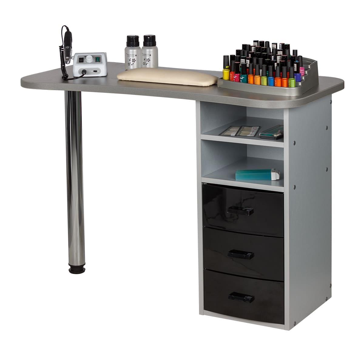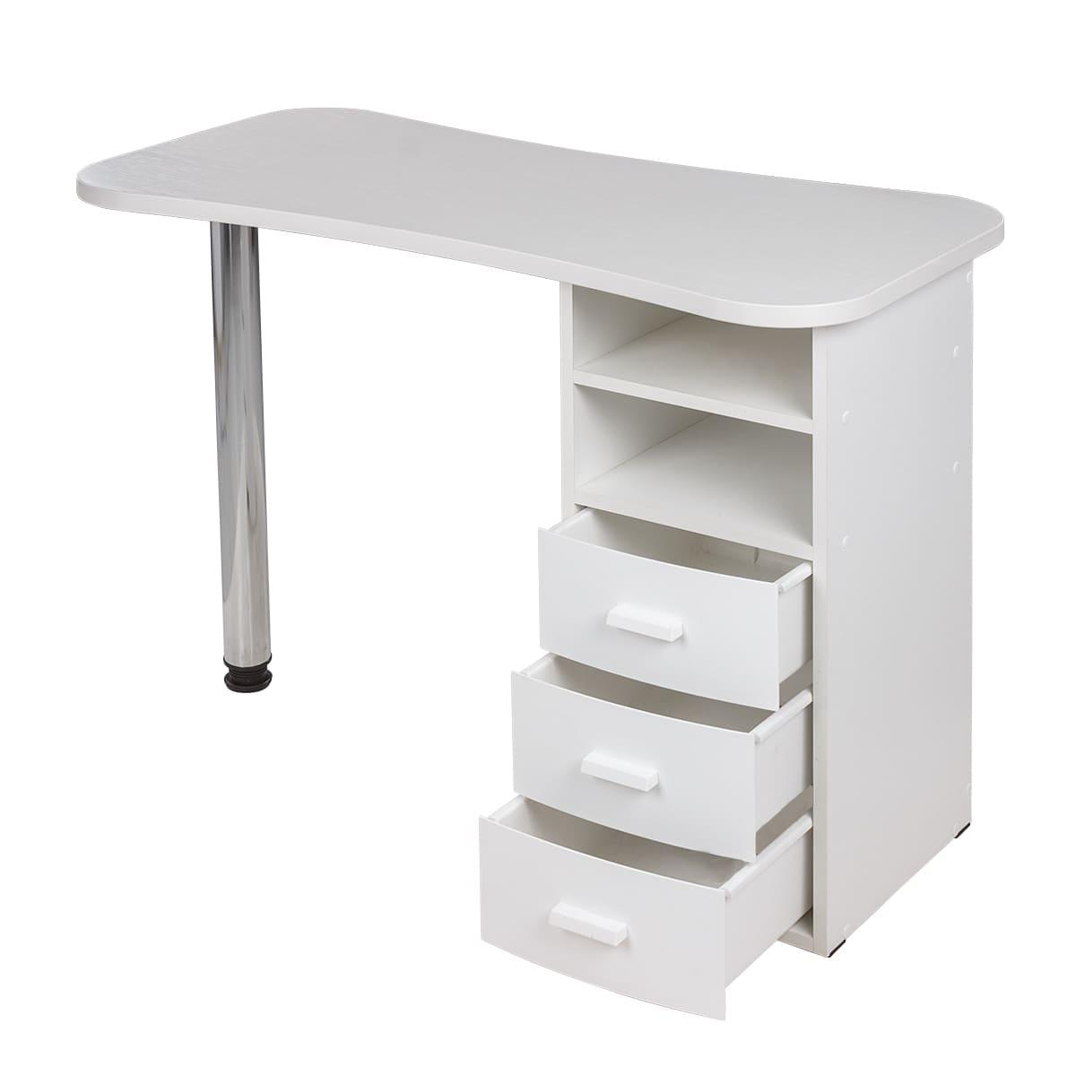 Столешница удобной изогнутой формы позволяет расставить необходимые инструменты и аппараты, а также обеспечивает доступ к рукам клиента. Секция хранения – тумба с тремя ящиками и двумя открытыми полками, в которых достаточно места для приспособлений мастера.