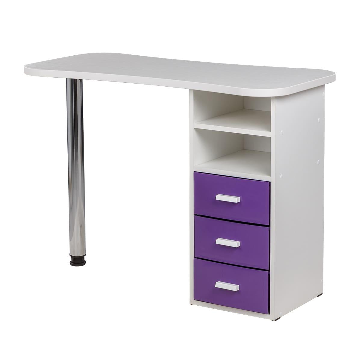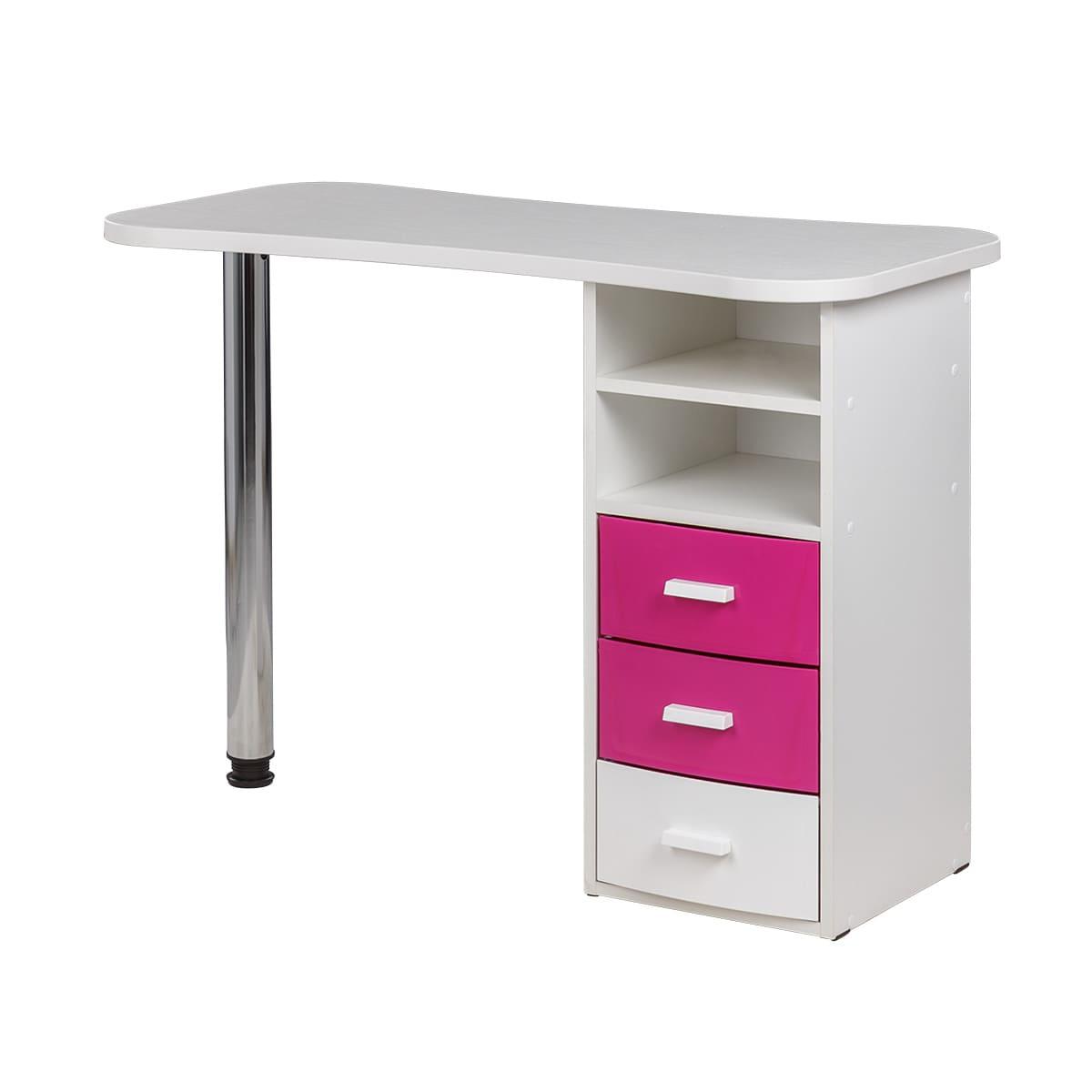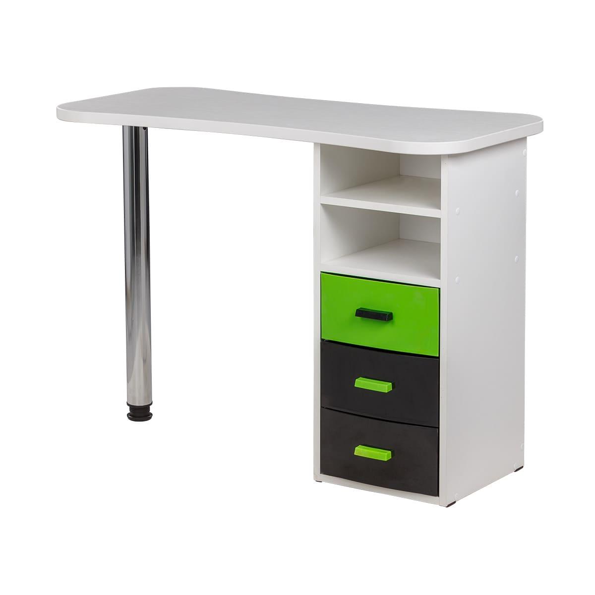 Маникюрный стол выполнен из прочной ЛДСП устойчивой к воздействию влаги. Края окантованы специальной ПВХ кромкой. Ножка изготовлена из хромированной стали и установлена на подпятник из резины. Ящики из прочного пластика хорошо моются, не деформируются после дезинфекции или случайно пролитых косметических средств. Расцветку ящиков можно выбрать из предложенных в каталоге цветов, чтобы маникюрное оборудование максимально гармонировало с интерьером салона.