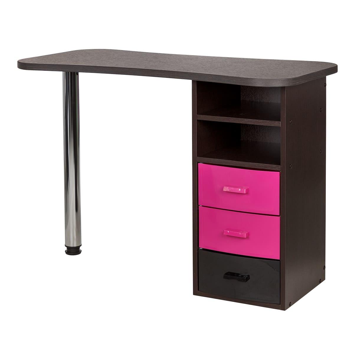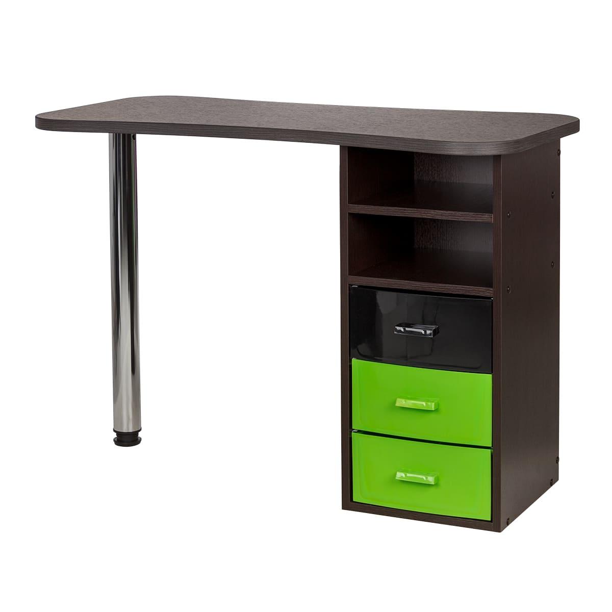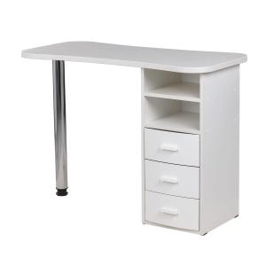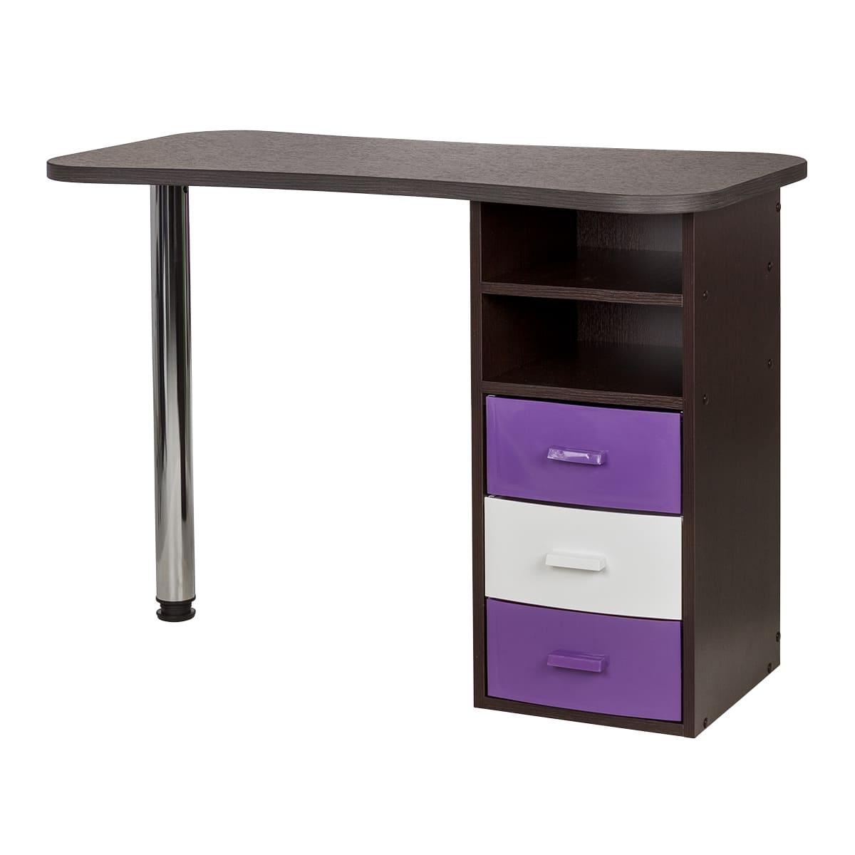 Маникюрный стол выполнен из прочной ЛДСП устойчивой к воздействию влаги. Края окантованы специальной ПВХ кромкой. Ножка изготовлена из хромированной стали и установлена на подпятник из резины. Ящики из прочного пластика хорошо моются, не деформируются после дезинфекции или случайно пролитых косметических средств. Расцветку ящиков можно выбрать из предложенных в каталоге цветов, чтобы маникюрное оборудование максимально гармонировало с интерьером салона.