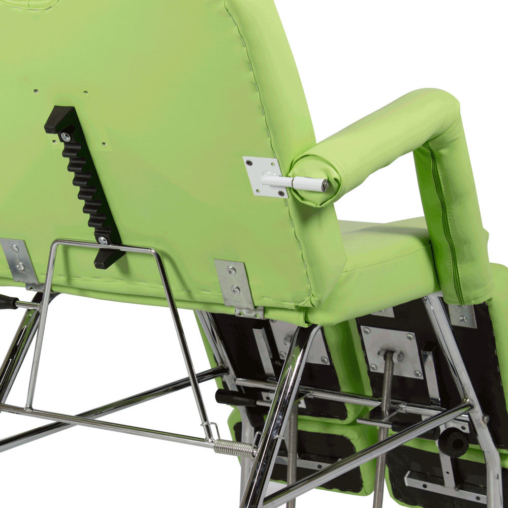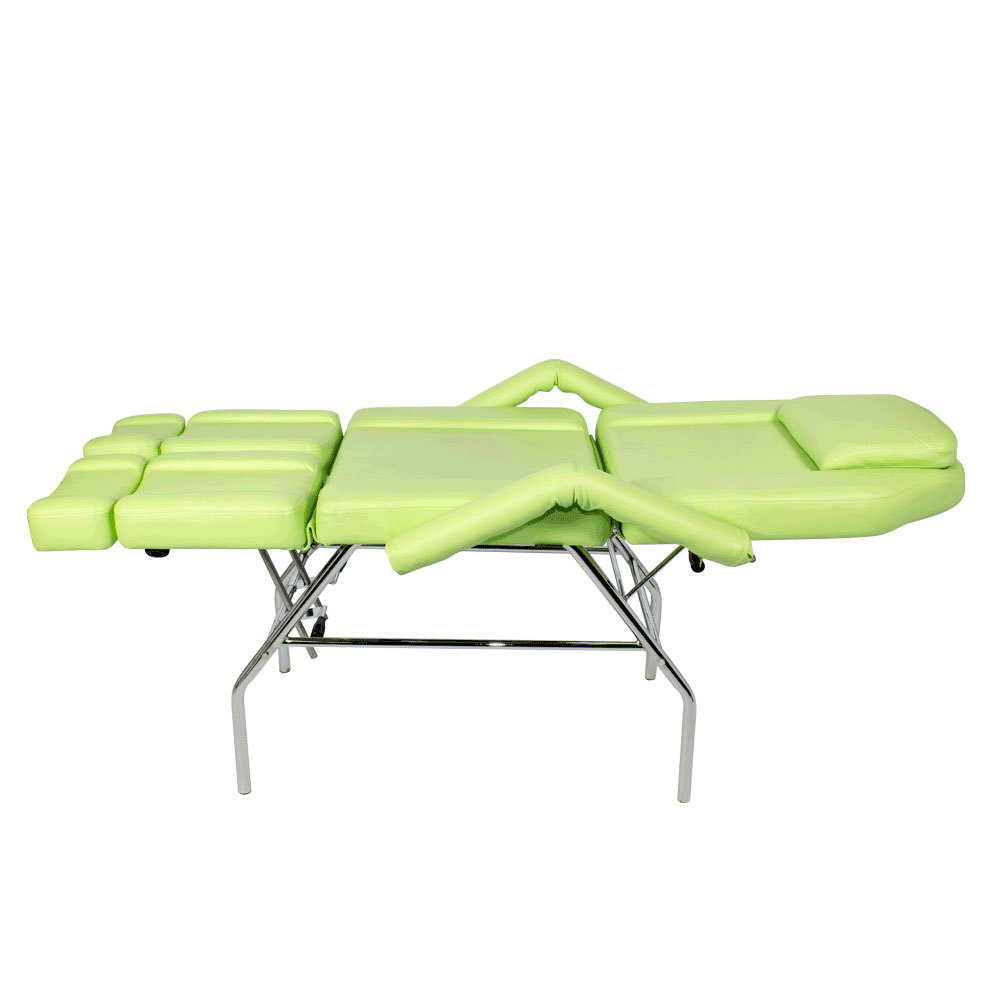 Комплектация: каркас на устойчивых ножках, сиденье, спинка с вырезом для лица и подушкой-подголовником, подлокотники, раздельные ножные части с выдвижными мягкими элементами для стоп.