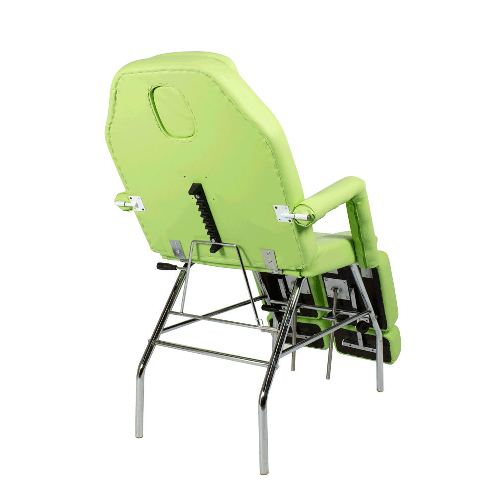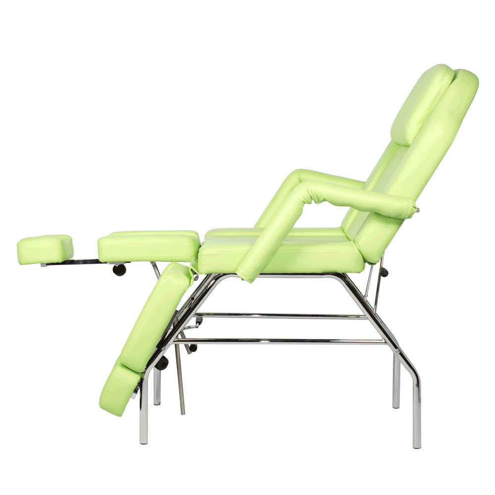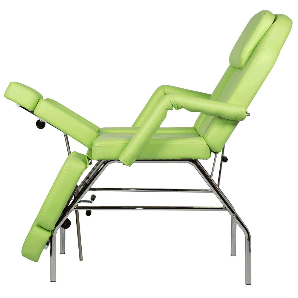 Педикюрное кресло МД-11 СТАНДАРТ относится к серии доступного оборудования по выгодной цене. Оно разработано для использования в кабинете мастера по педикюру или косметолога. Наклон спинки и подножек регулируется с помощью механики до горизонтального положения. В спинке есть отверстие для лица, которое закрывается подголовником. Кресло установлено на прочный каркас из хромированного металла на ножках, который обеспечивает устойчивость как в сидячем, так и лежачем положении.