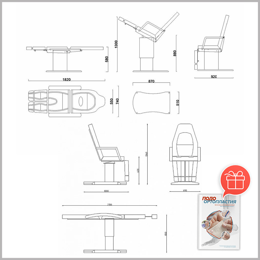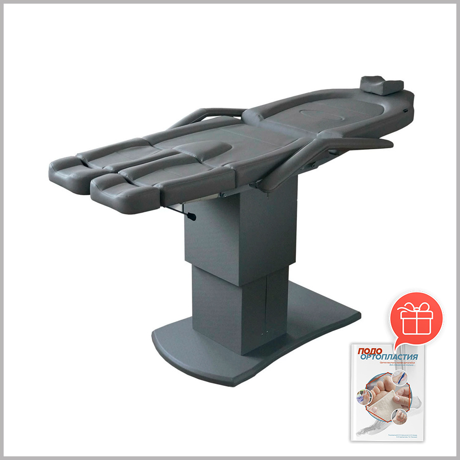 Педикюрное кресло оснащено двумя электромоторами, обеспечивающими регулировку высоты и угла наклона сиденья. Опоры для ног фиксируются при помощи газ-лифтов. Кресло легко раскладывается в горизонтальное положение, образуя ровную поверхность. Надежная конструкция системы подъема обеспечивает высокую устойчивость кресла даже при максимальной высоте. Управляется при помощи ручного проводного пульта.