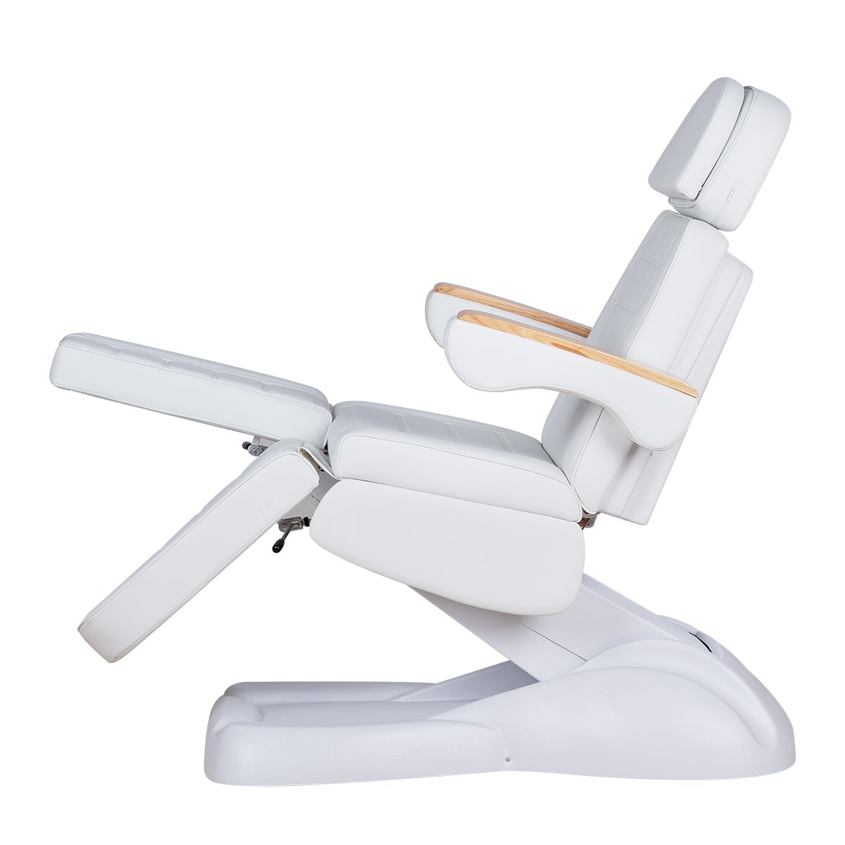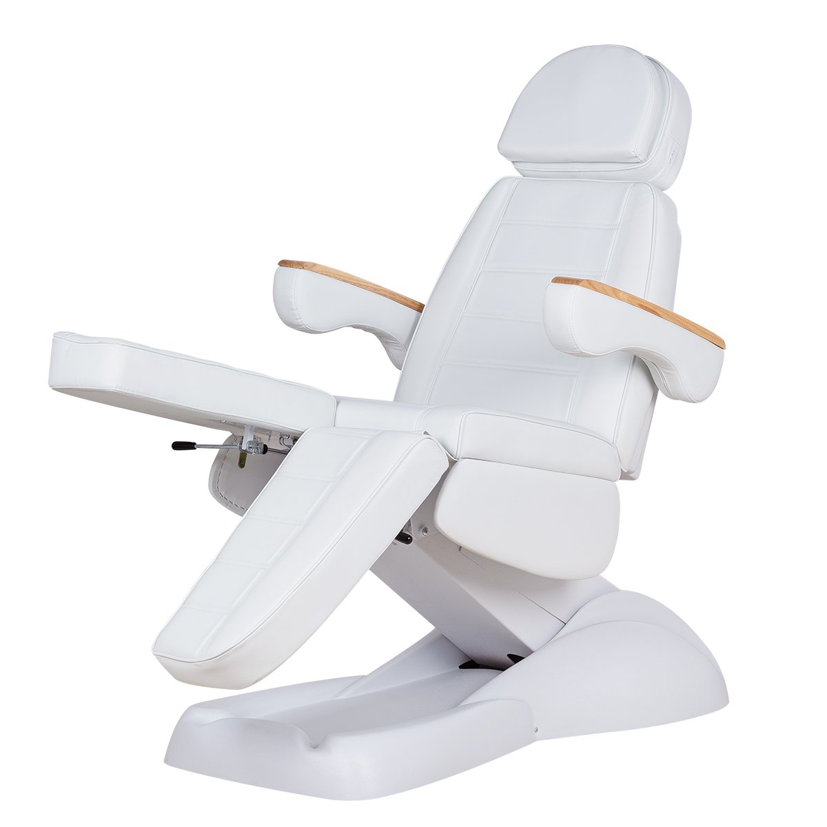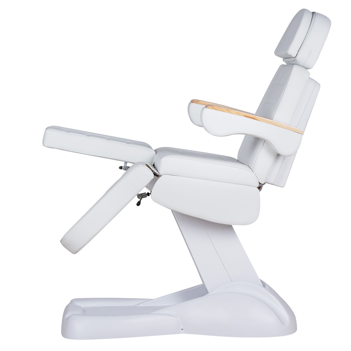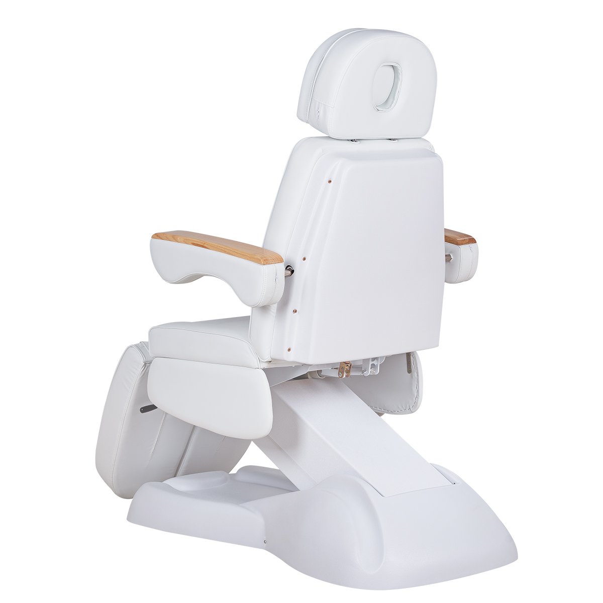 Кресло имеет устойчивое широкое основание, конструкция полностью раскладывается в горизонтальное положение, имеются выдвижной подголовник с отверстием для лица, которое при необходимости можно закрыть мягкой подушкой и съёмные подлокотники со стильными деревянными вставками. Модель можно использовать для различных процедур: педикюр, наращивание ресниц, косметология, оформление бровей и т.д.
