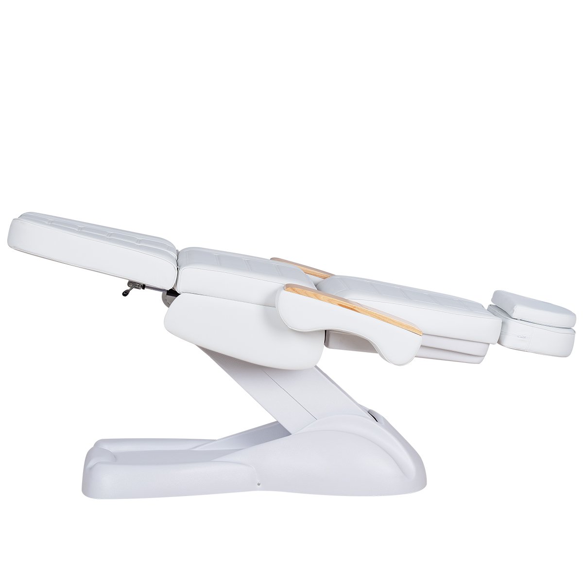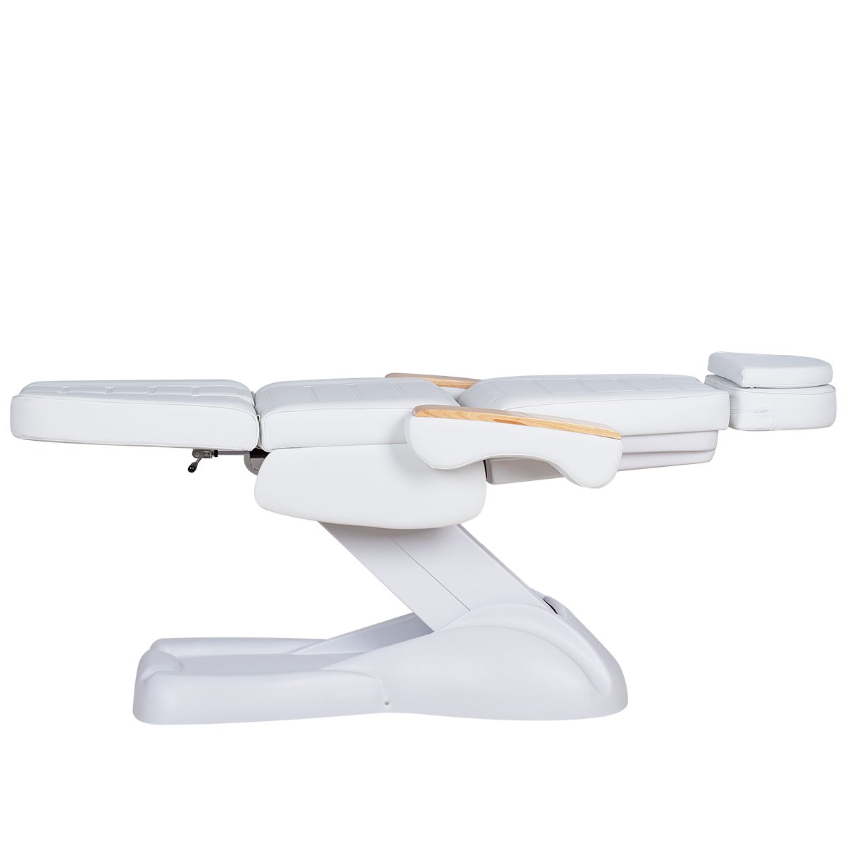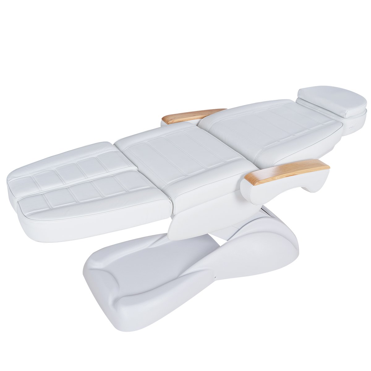Кресло имеет устойчивое широкое основание, конструкция полностью раскладывается в горизонтальное положение, имеются выдвижной подголовник с отверстием для лица, которое при необходимости можно закрыть мягкой подушкой и съёмные подлокотники со стильными деревянными вставками. Модель можно использовать для различных процедур: педикюр, наращивание ресниц, косметология, оформление бровей и т.д.