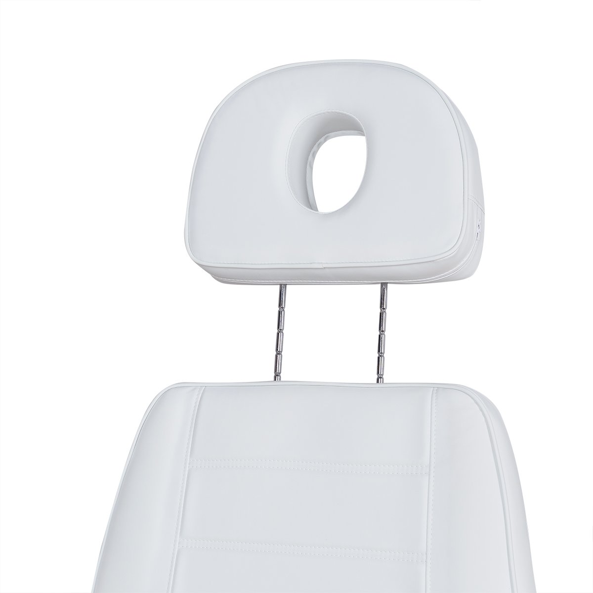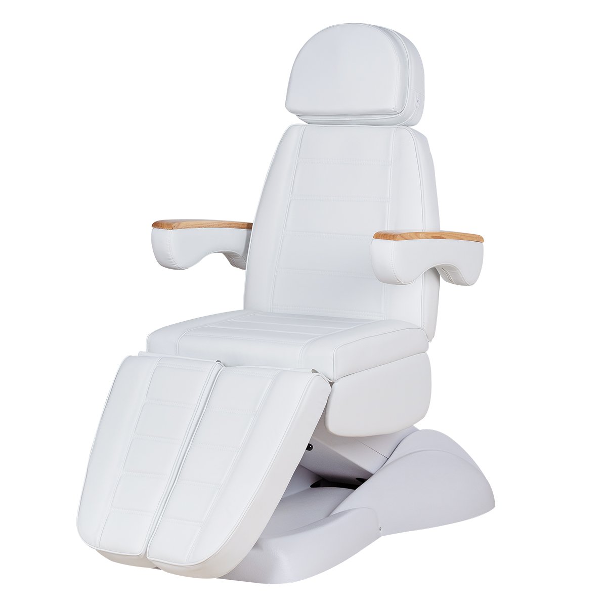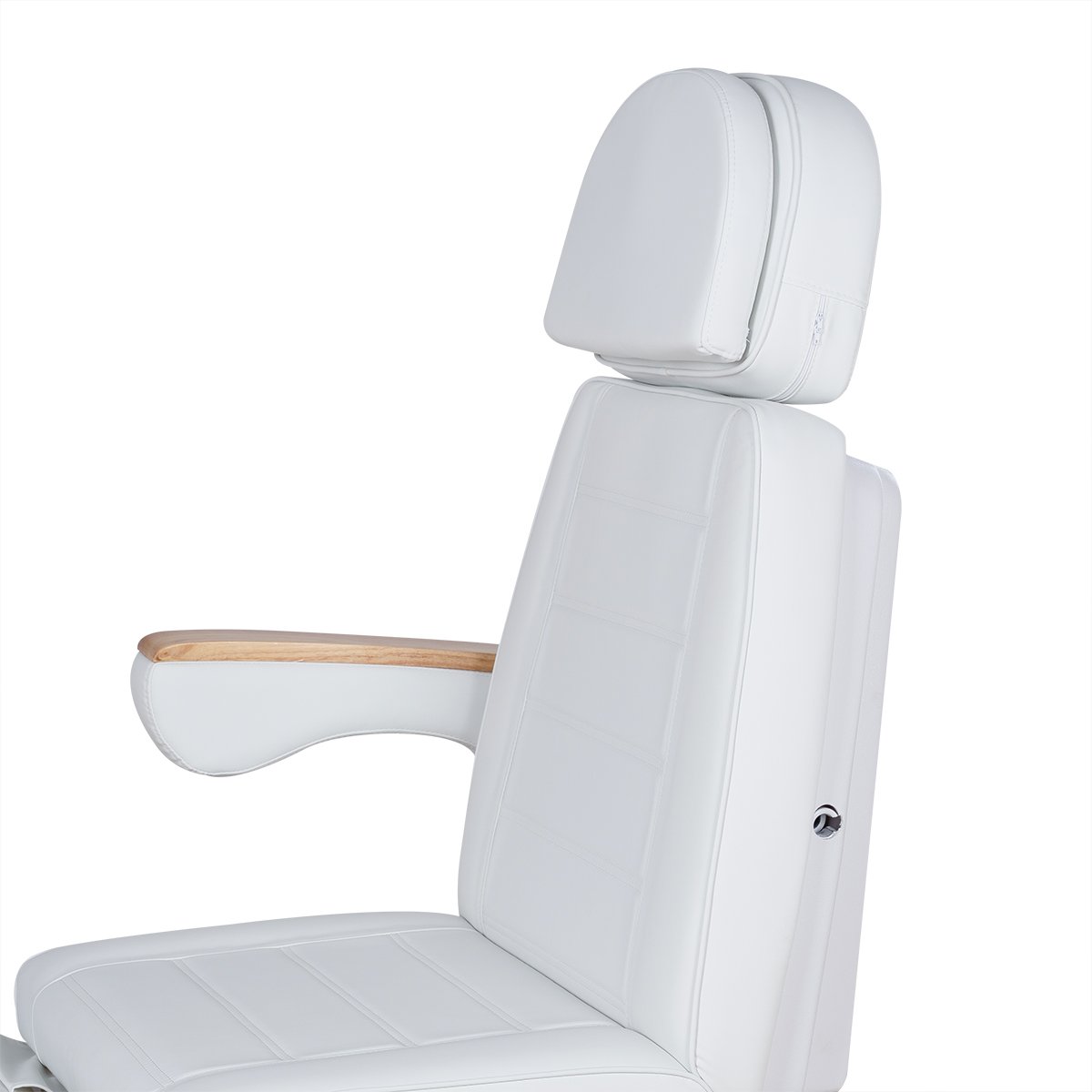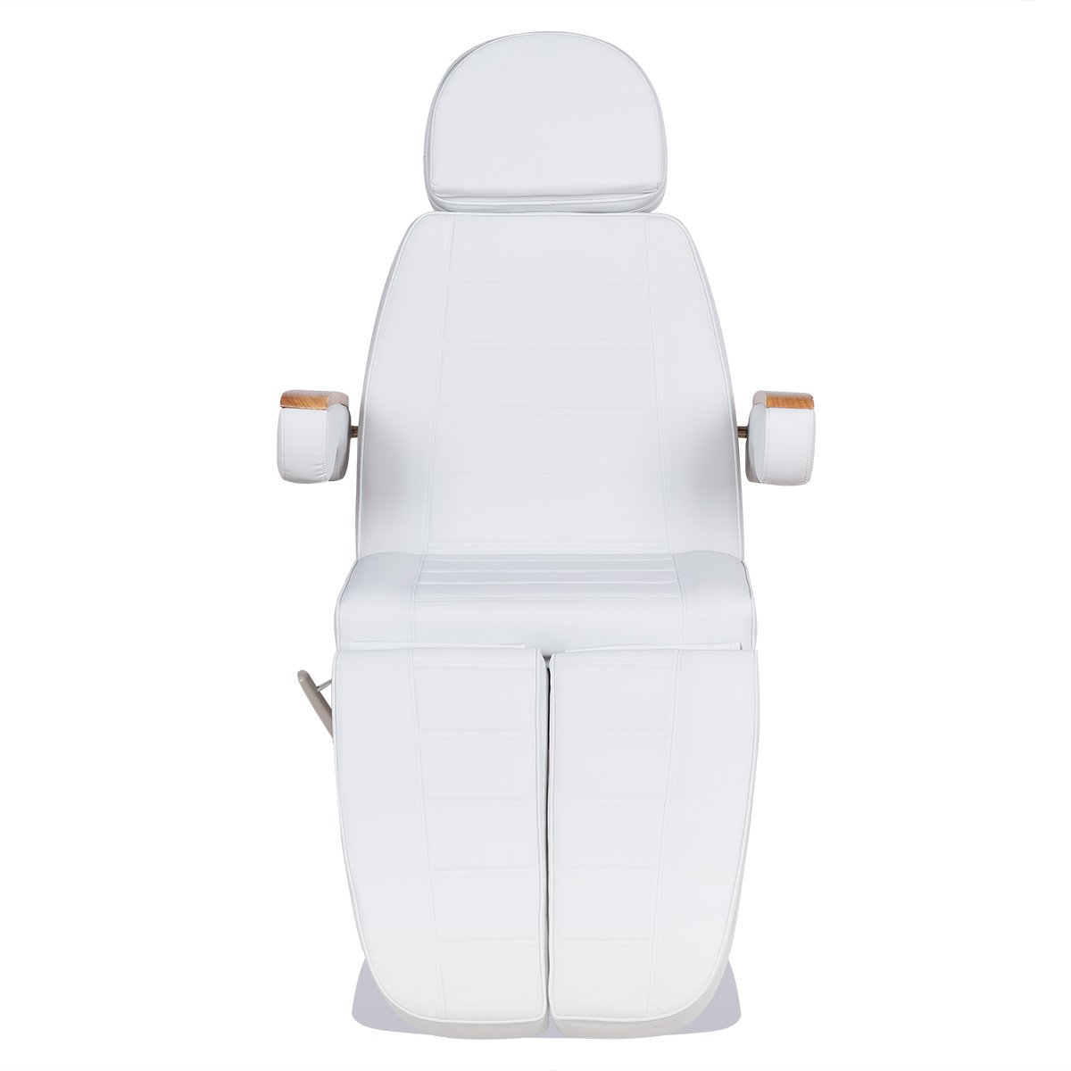 Кресло имеет устойчивое широкое основание, конструкция полностью раскладывается в горизонтальное положение, имеются выдвижной подголовник с отверстием для лица, которое при необходимости можно закрыть мягкой подушкой и съёмные подлокотники со стильными деревянными вставками. Модель можно использовать для различных процедур: педикюр, наращивание ресниц, косметология, оформление бровей и т.д.