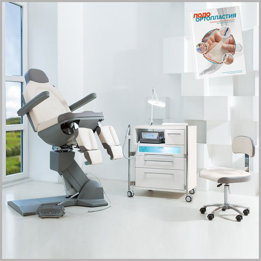 Универсальная тумба, которая может использоваться как в педикюрном, так и в косметологическом кабинете. Рабочая поверхность верхней полки достаточно большая и позволяет разместить практически любой аппарат, расходные материалы, косметику. Верхнюю полку можно укомплектовать рейлинговым ограждением, предохраняющим инструменты и аксессуары от падения.
