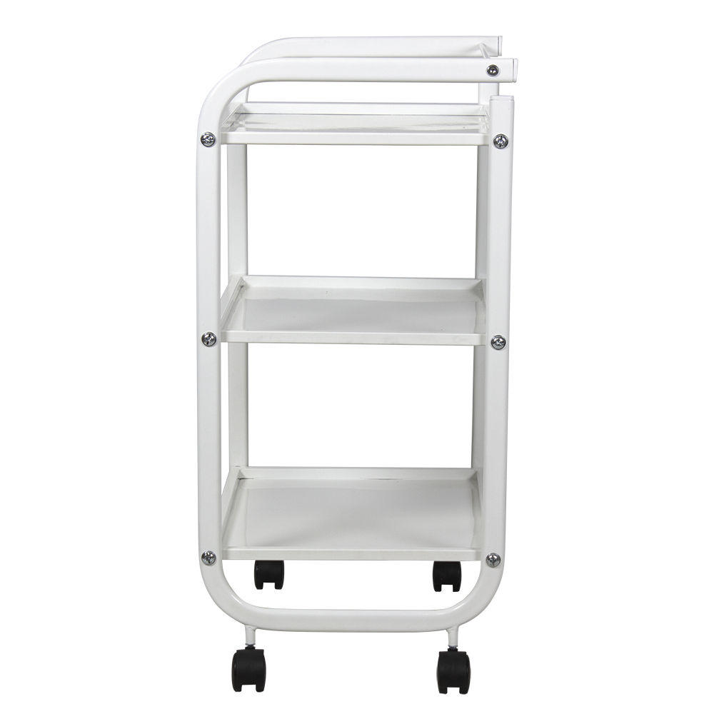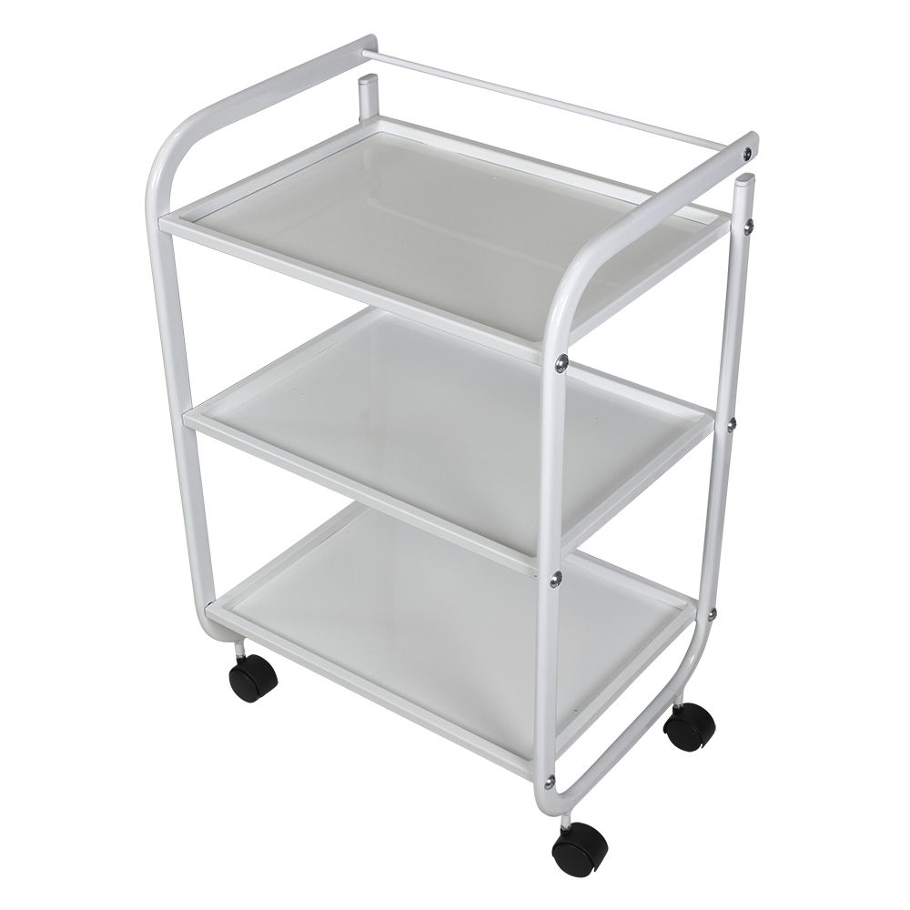 - Столик косметолога: каркас из металла, с защитным покрытием белого цвета, три открытые полки из МДФ, с облицовкой из прочного белого пластика, четыре колеса из прочного черного пластика