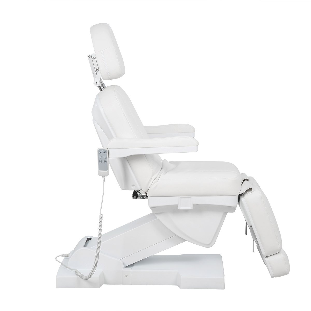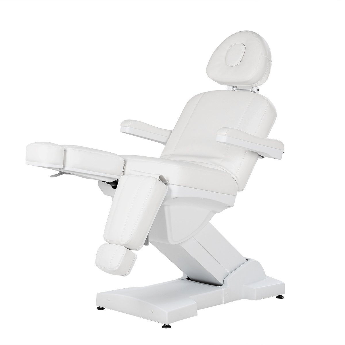 - Кресло для педикюра: каркас из прочного металла, покрытого защитной порошковой краской белого цвета, мягкие детали из поролона с эффектом памяти, обивочный материал – экокожа высокого качества, мягкие элементы под ноги с выдвижными подпятниками, съемные подлокотники, подголовник с вырезом для лица и съемной подушкой, электропривод (3 мотора) с пультом управления