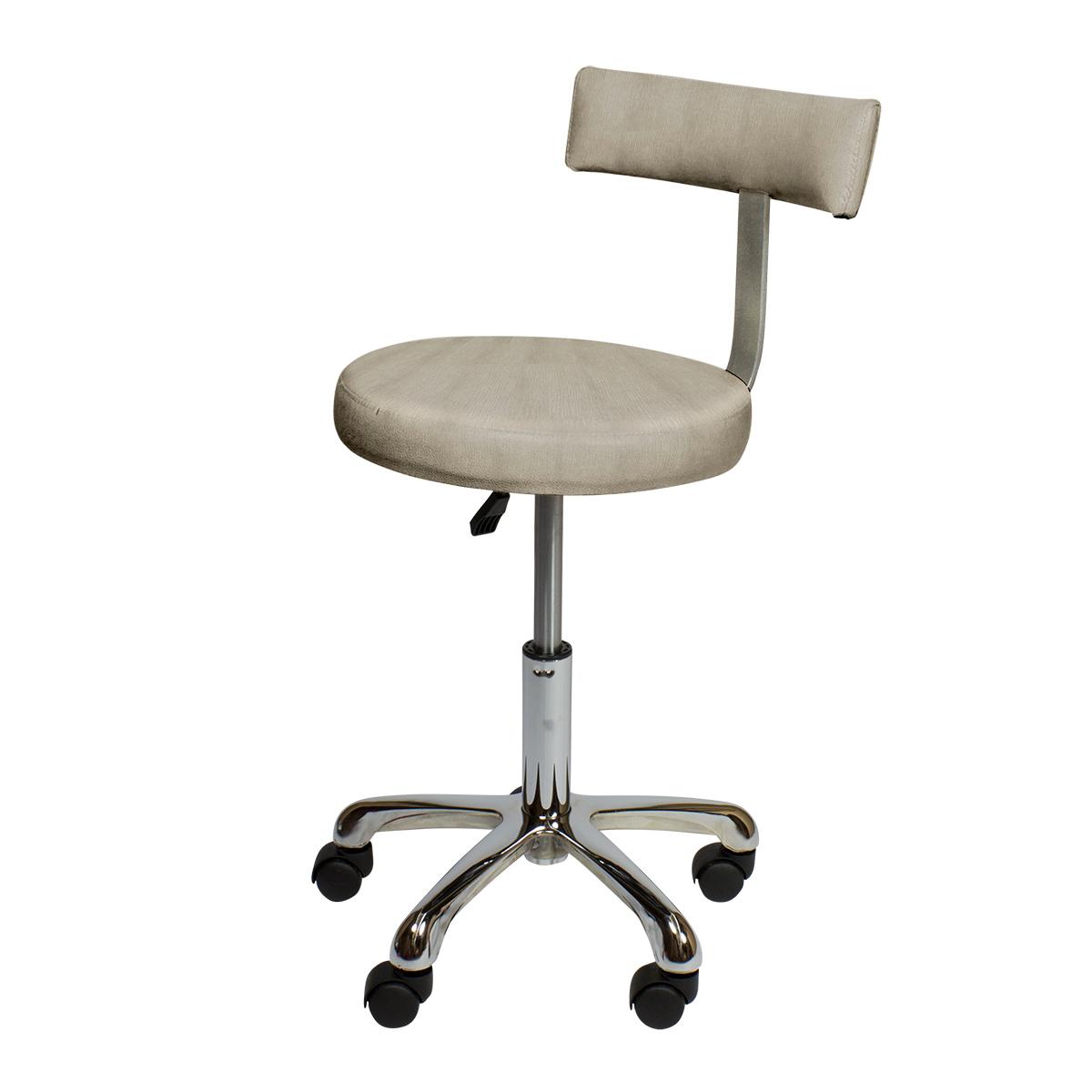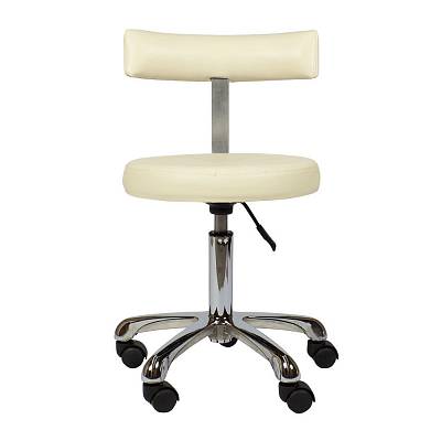 - Стул мастера по педикюру: модель комплектуется эргономичным сиденьем круглой формы и высокой анатомической спинкой, которые соединены между собой надежным каркасом из полированного металла, обивочный материал – влагоустойчивая экокожа, основание – пятилучье из прочного хромированного металла, установленого на легко вращающиеся пластиковые колеса, по высоте регулируется пневматикой.