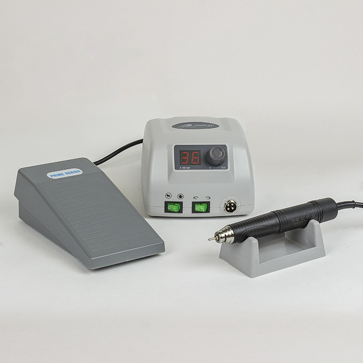 - Аппарат для маникюра/педикюра: комплектация аппарата - блок питания, ручка с микромотором, подставка для ручки, ножная педаль. На верхней части панели блока питания находятся кнопки реверса, включения и выключения, регулятор скорости и разъем для подключения ручки. К блоку присоединена ручка с микромотором. Цанговый зажим плотно фиксирует фрезу, не допуская проворачивания инструмента во время процедуры. Для фрез в корпусе блока предусмотрены специальные отверстия. Время непрерывной работы до 12-ти часов.