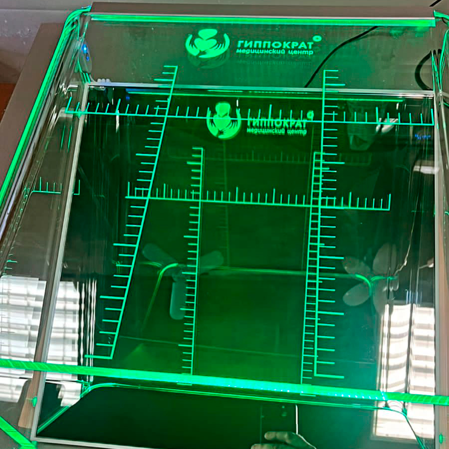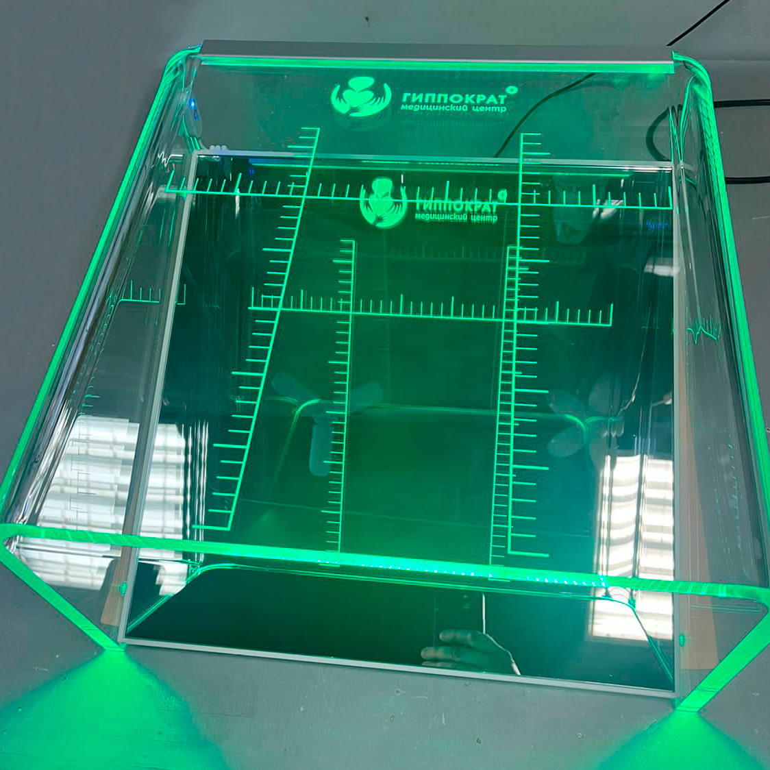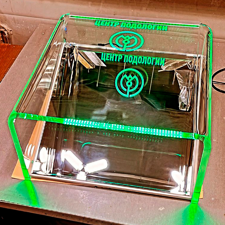 Прочность и жесткость конструкции. Наличие радиусных элементов повышает несущую способность плантоскопа. Корпус, изготовленный из высокопрочного литьевого акрилового стекла толщиной 15 мм, выдерживает вес до 300 кг, не прогибается, устойчив к деформации, ударам и износу.