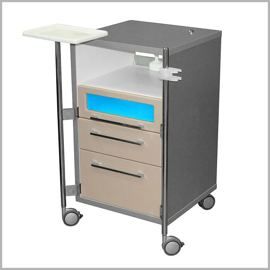 Средний ящик тумбы оснащен УФО-модулем с бактерицидной лампой для стерилизации инструмента, включающимся электромагнитным контактом при закрывании ящика. При открывании ящика срабатывает механизм, отключающий опасное для глаз УФ-излучение.