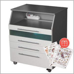 Тумба укомплектована УФО-блоком с бактерицидной лампой для стерилизации инструмента, который включается электромагнитным контактом при закрывании ящика. При открывании ящика срабатывает механизм, отключающий опасное для глаз УФ-излучение.