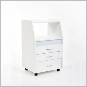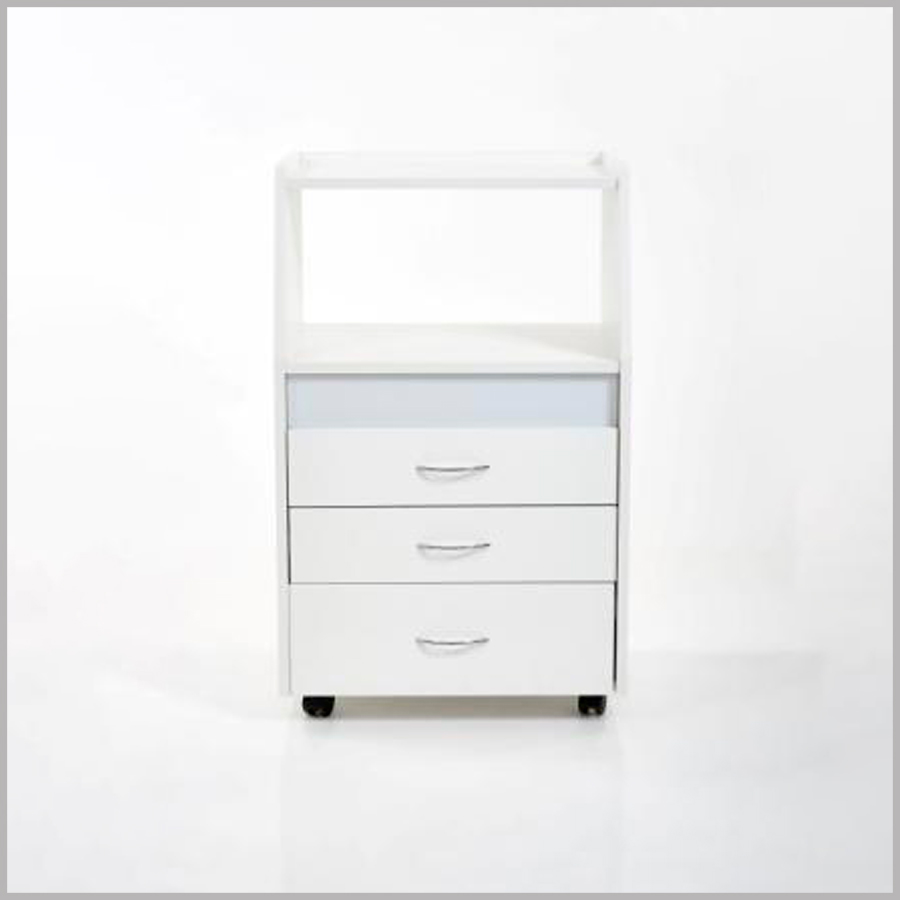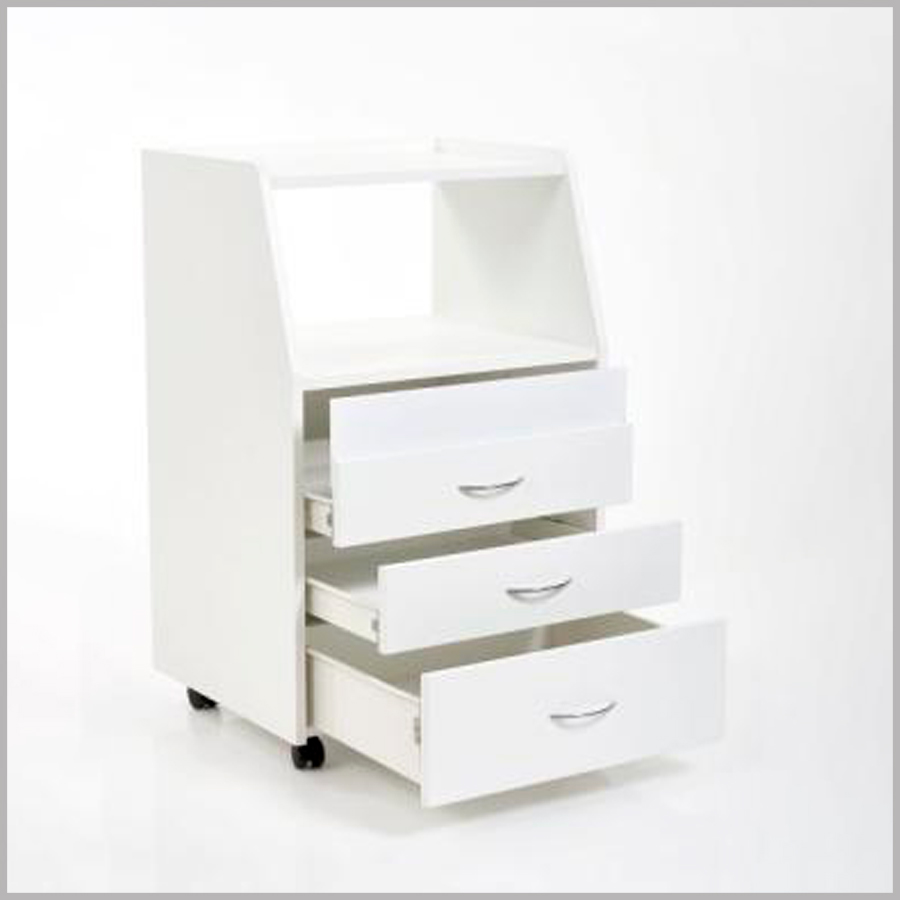 Косметологическая тележка разделена на 3 выдвижных ящика и одну полку. Верхний ящик оснащен УФ-лампой (8Вт) для хранения стерилизованных инструментов. В остальных ящиках достаточно места, чтобы разложить приспособления мастера. Полка предназначена для установки аппаратов или принадлежностей первой необходимости. Перемещать косметологическое оборудование можно с помощью вращающихся колес.