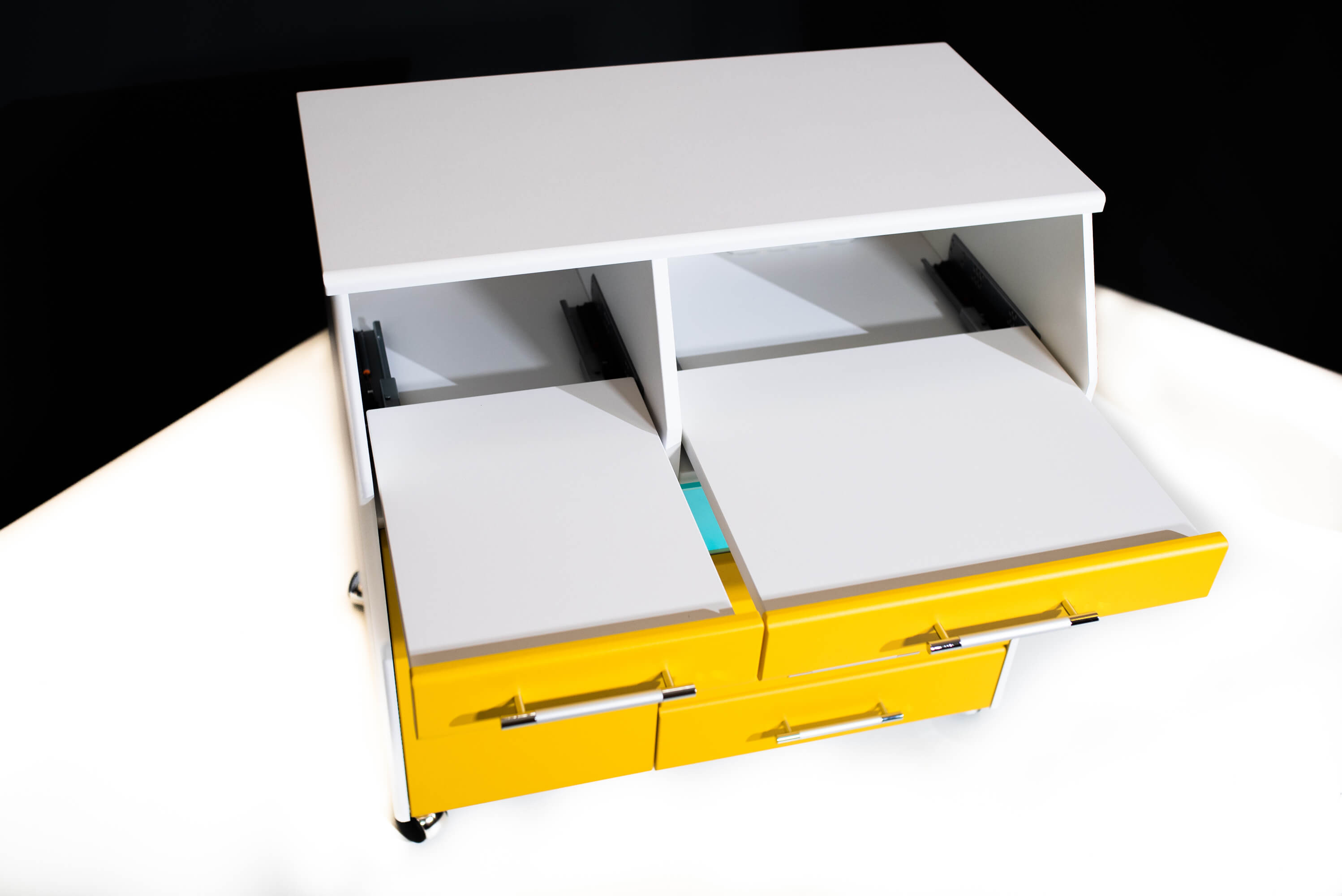 Тумба выполнена из двух отделений. Вместительные удобные выдвижные ящики, в которых можно разместить все необходимые мастеру инструменты, препараты и аксессуары, оснащены направляющими с системой самодоведения, что обеспечивает плавность открывания и закрывания.