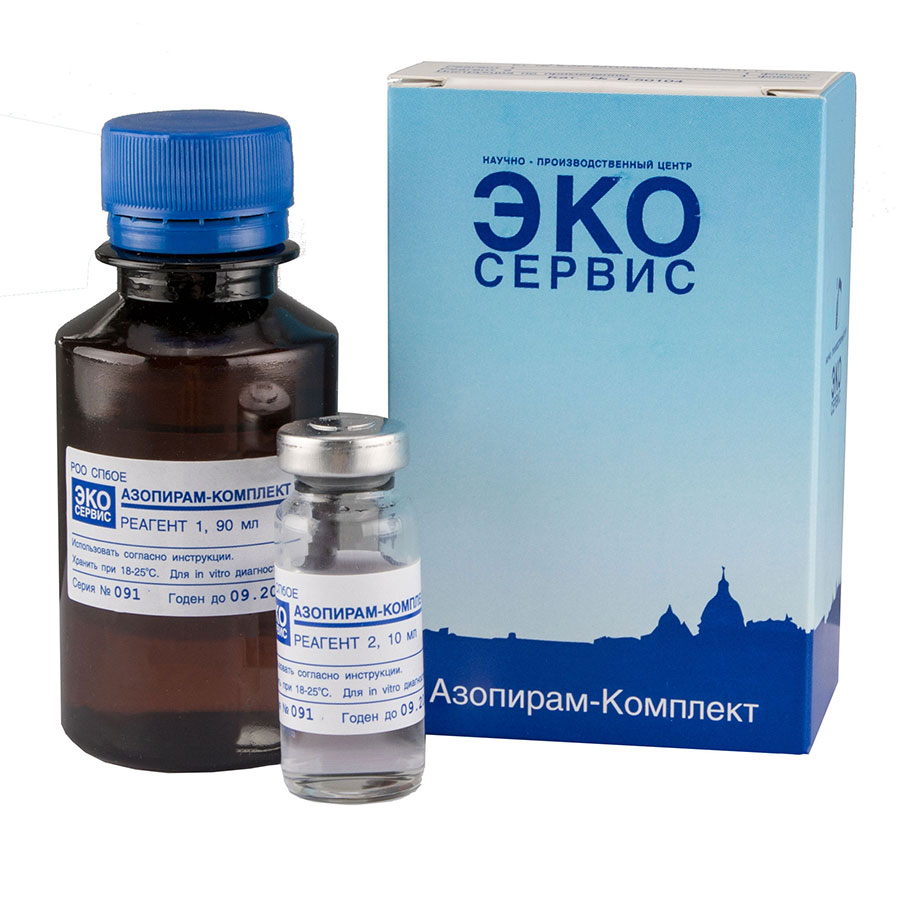 Азопирам Комплект включает в себя готовые спиртовые растворы анилина (10 мл) и амидопирина (90 мл). Одного набора Азопирама хватает в среднем на 2000 постановок реакций (при расходе рабочего раствора – 2 капли на реакцию).