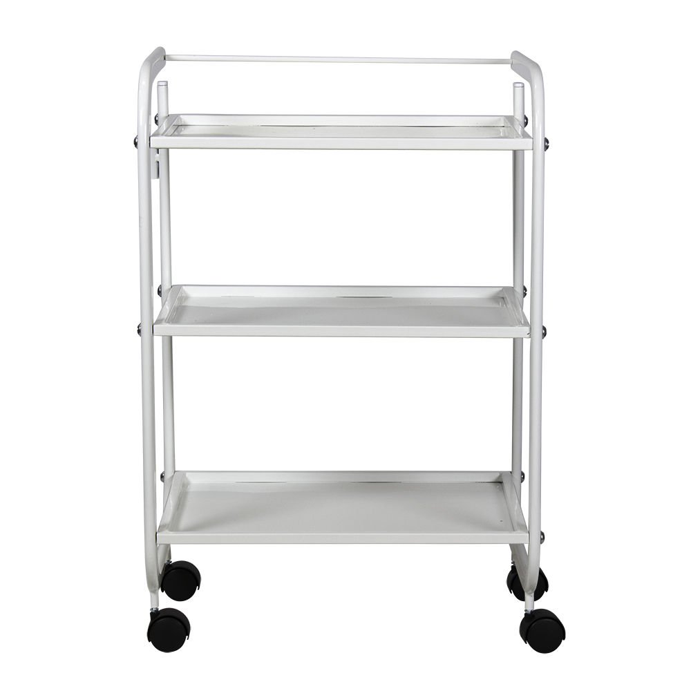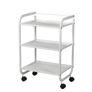 Комплектация: металлическое основание, три полки с бортами, пластиковые колёса (4 штуки).