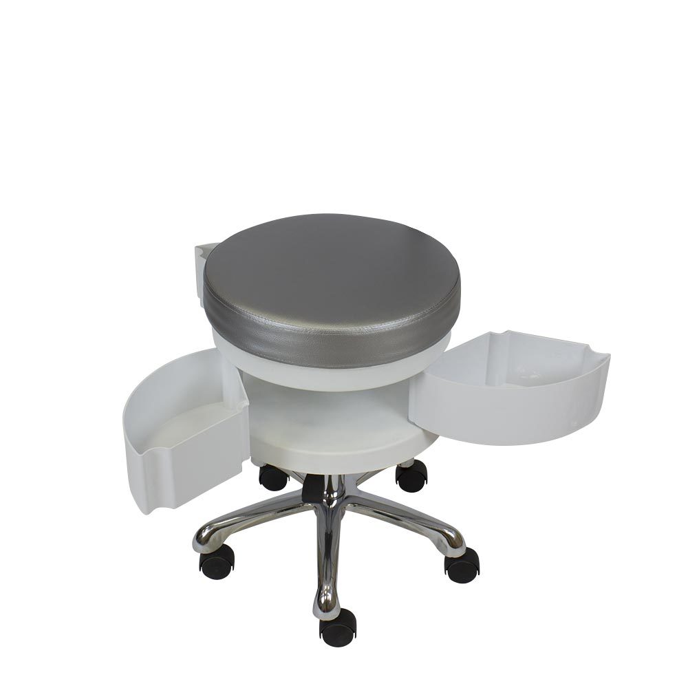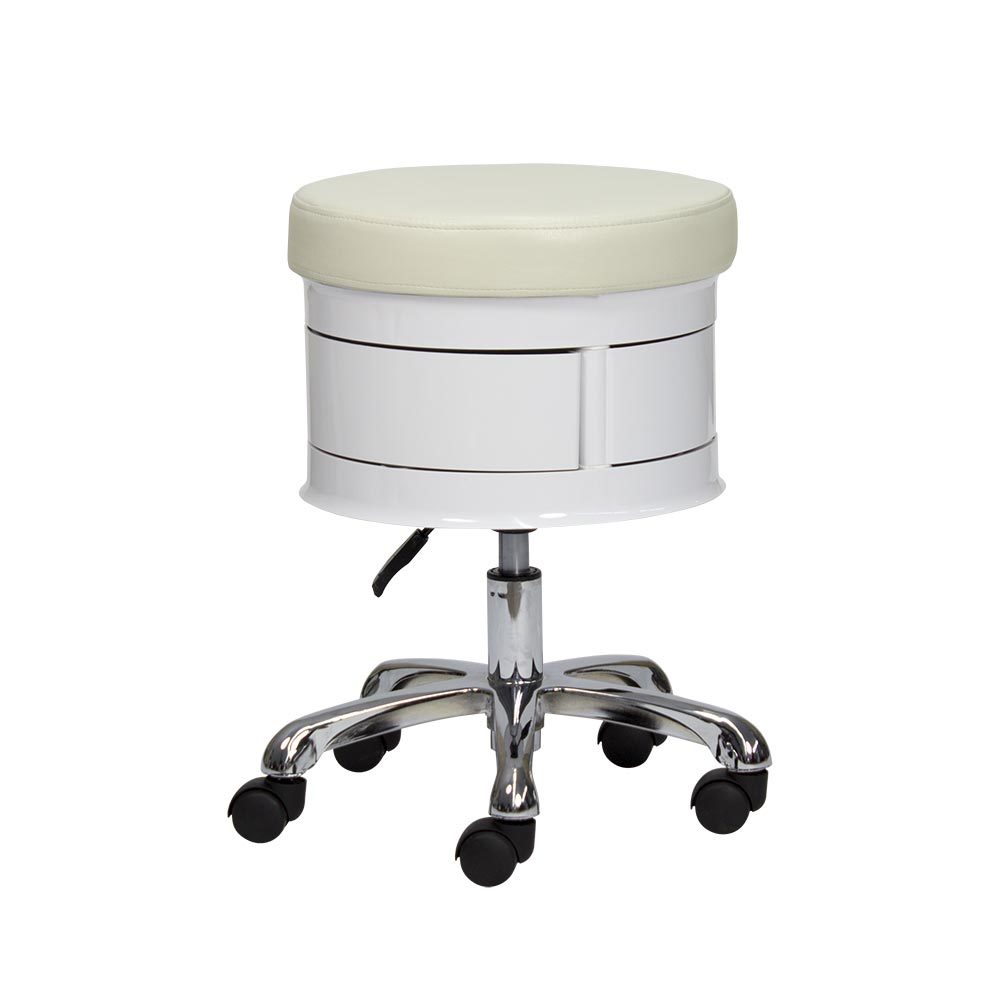 Для комфортной посадки предусмотрено мягкое сидение. В нижней части есть практичные ящики, чтобы держать необходимый инструмент во время проведения процедур. Для удобного перемещения стул укомплектован поворотными колесиками. Теперь не придется лишний раз вставать и передвигать мебель вручную. С помощью пневматического механизма регулируется высота стула, что позволит подобрать удобное положение.