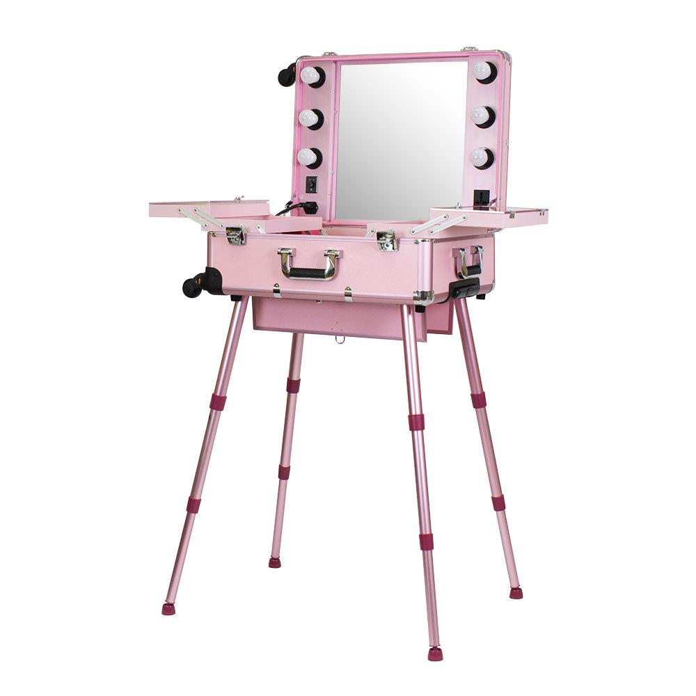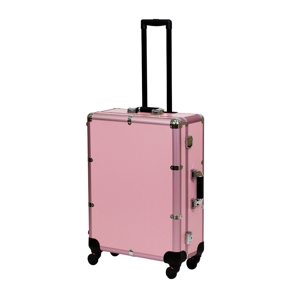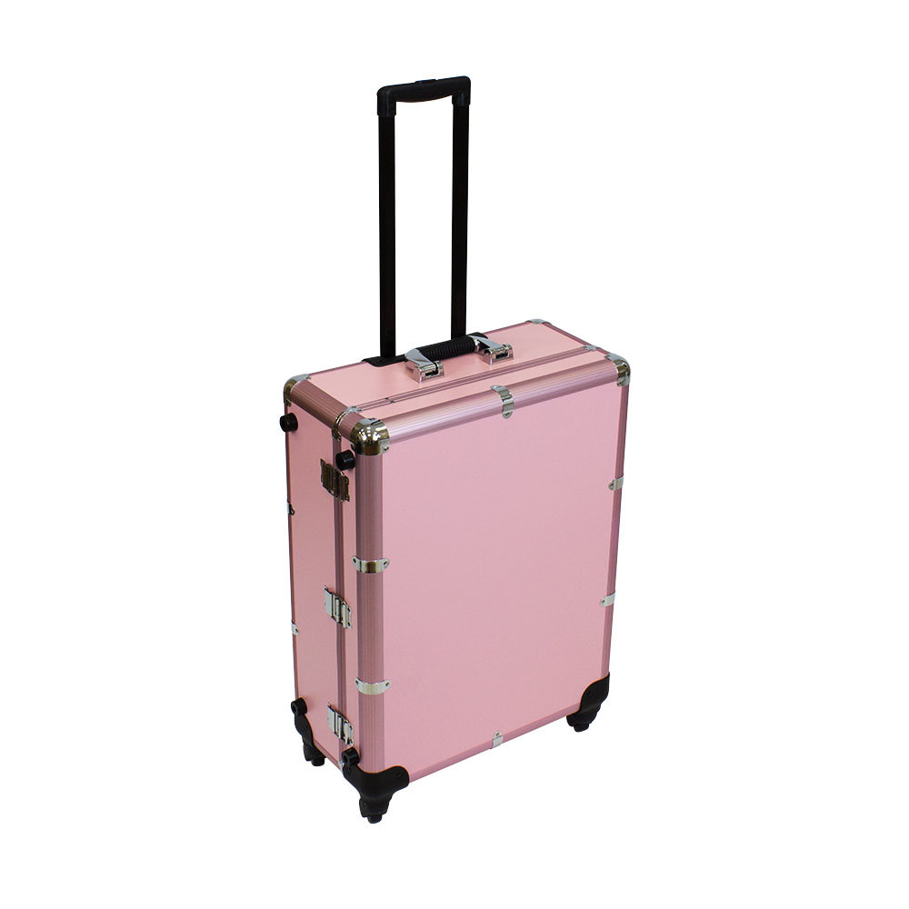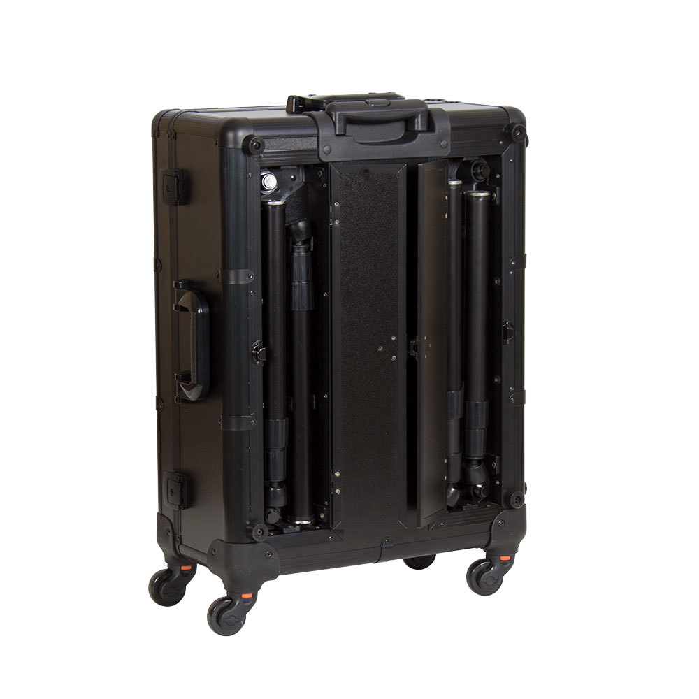 Студия визажиста собирается в компактный чемодан на колёсиках с удобной выдвижной ручкой. Поэтому её легко транспортировать, что делает её незаменимым помощником для выездной работы. Для дополнительной безопасности кейс закрывается на два ключа.