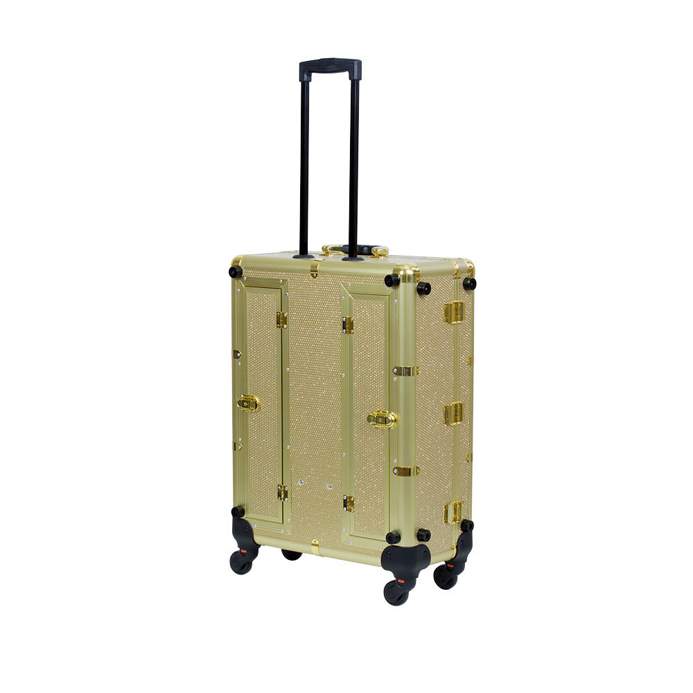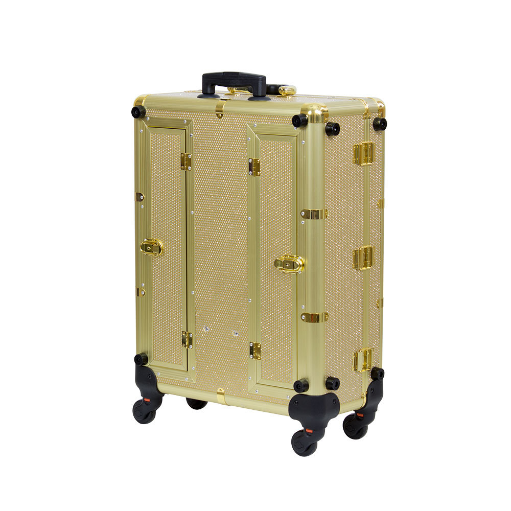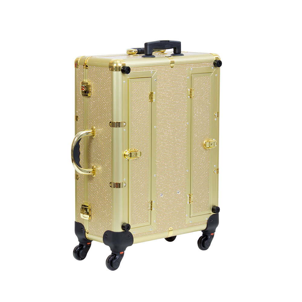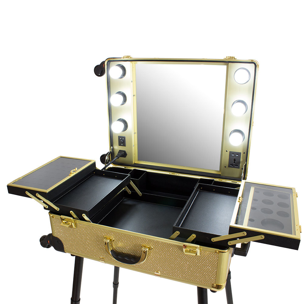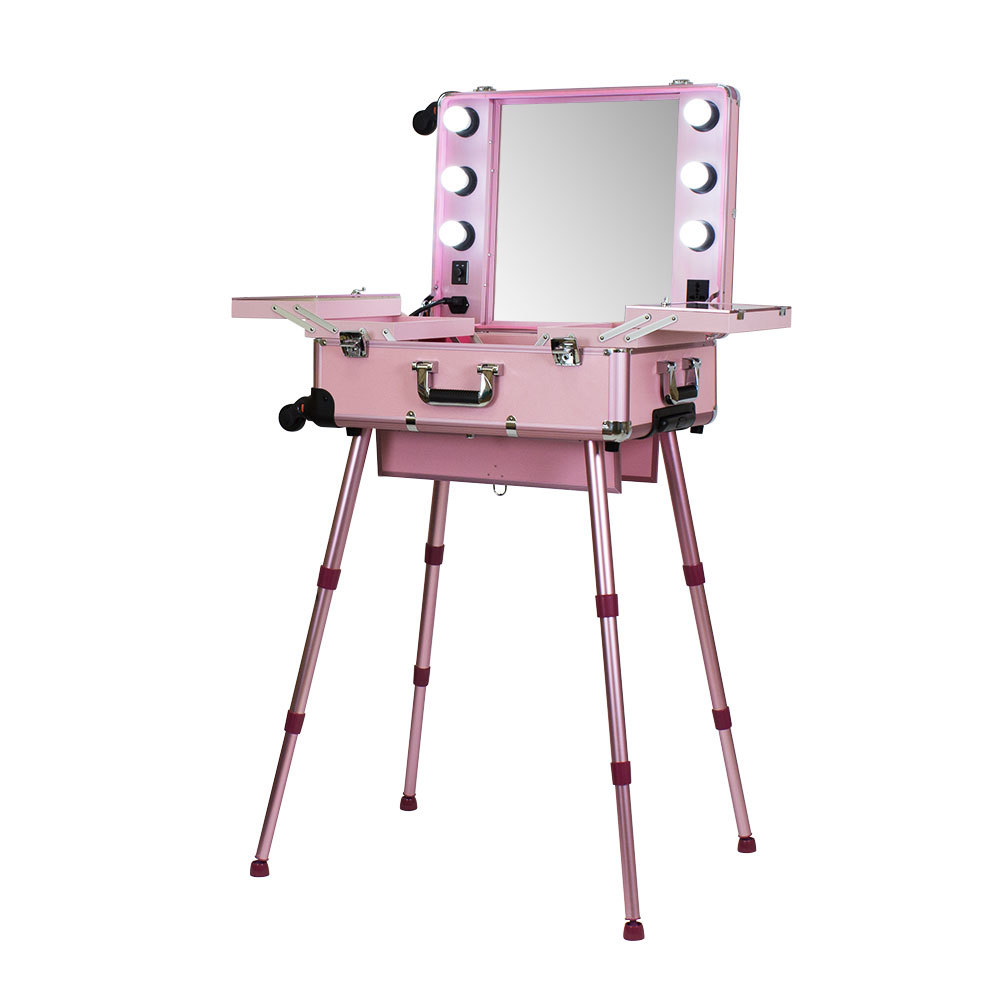 Студия визажиста собирается в компактный чемодан на колёсиках с удобной выдвижной ручкой. Поэтому её легко транспортировать, что делает её незаменимым помощником для выездной работы. Для дополнительной безопасности кейс закрывается на два ключа.