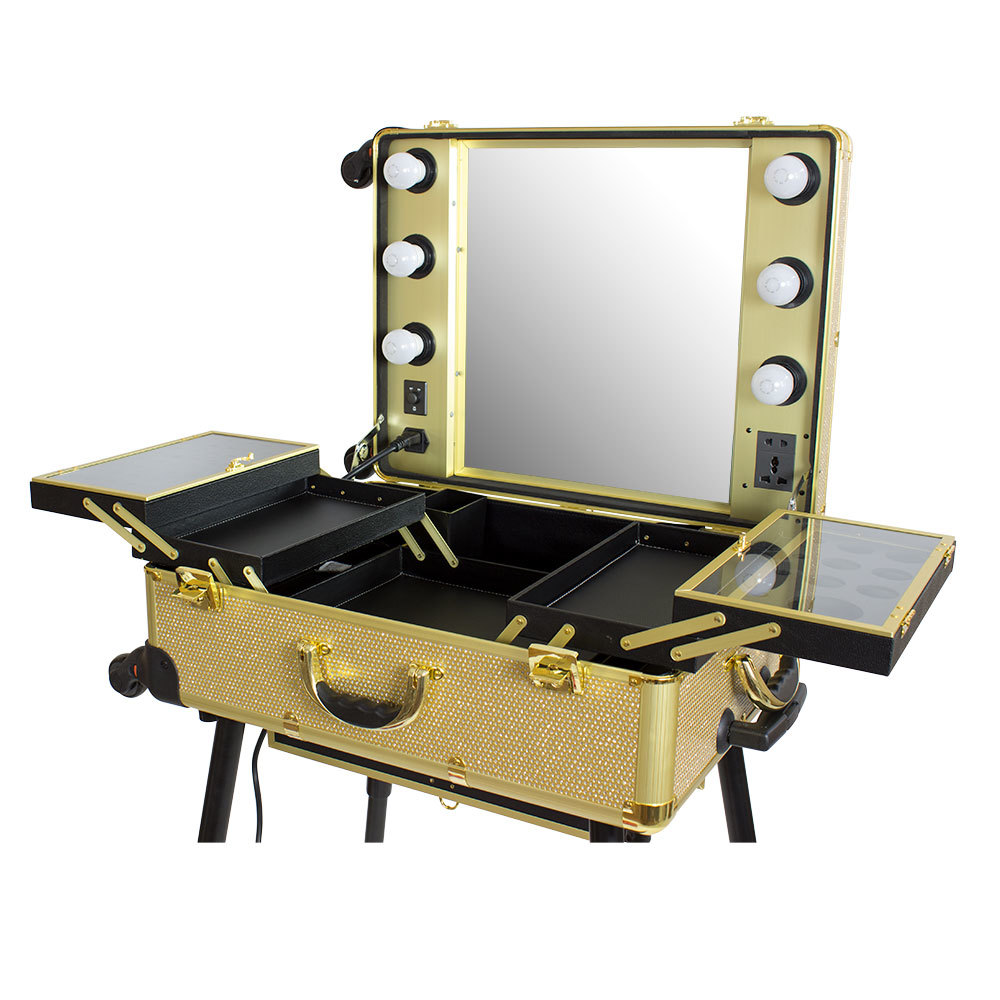 Комплектация: чемодан на колёсах с выдвижной ручкой, зеркало, 6 LED-ламп, полочки, телескопические ножки, шнур, 2 замка и ключи.